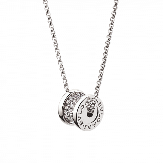 The B.ZERO1 necklace draws inspiration from the world-famous amphitheater - the Colosseum, truly demonstrating BULGARI's creative perspective and challenging the essence of jewelry design. Its unique pure spiral shape symbolizes the harmonious connection between past, present and future - reflected in the splendor of the Eternal City - and the pioneering spirit of the collection. B.ZERO1 series necklace, made of 18K white gold and decorated with pavé diamonds.