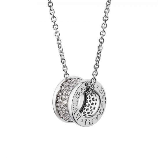 The B.ZERO1 necklace draws inspiration from the world-famous amphitheater - the Colosseum, truly demonstrating BULGARI's creative perspective and challenging the essence of jewelry design. Its unique pure spiral shape symbolizes the harmonious connection between past, present and future - reflected in the splendor of the Eternal City - and the pioneering spirit of the collection. B.ZERO1 series pendant with necklace, made of 18K white gold and decorated with pavé diamonds. Length 14.82-17.75 inches.
