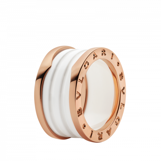 B. The ZERO1 ring draws inspiration from the world-renowned amphitheater - the Colosseum of Rome, truly showcasing BULGARI's creative perspective and challenging the essence of jewelry design. Its unique and pure spiral shape symbolizes the harmony between the past, present, and future - reflected in the magnificent Eternal City - and the pioneering spirit of the series. B. The ZERO1 series four ring ring is made of 18K rose gold material and decorated with white ceramics.