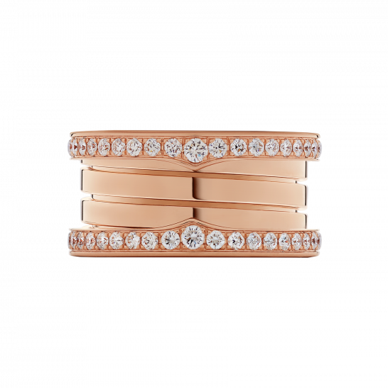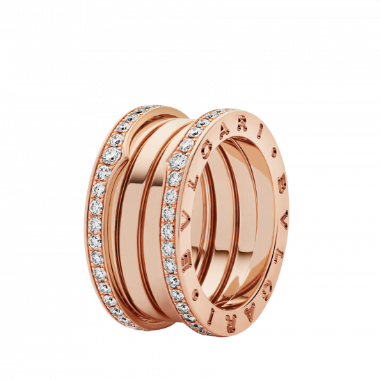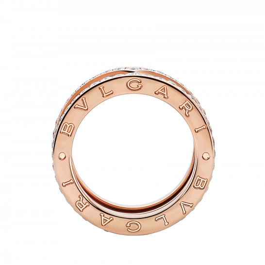 The B.ZERO1 ring draws inspiration from the world-famous amphitheater - the Colosseum, truly demonstrating BULGARI's creative perspective and challenging the essence of jewelry design. Its unique pure spiral shape symbolizes the harmonious connection between past, present and future - reflected in the splendor of the Eternal City - and the pioneering spirit of the collection. B.ZERO1 series four-ring ring, made of 18K rose gold and decorated with pavé diamonds on the edge. Price varies with size.