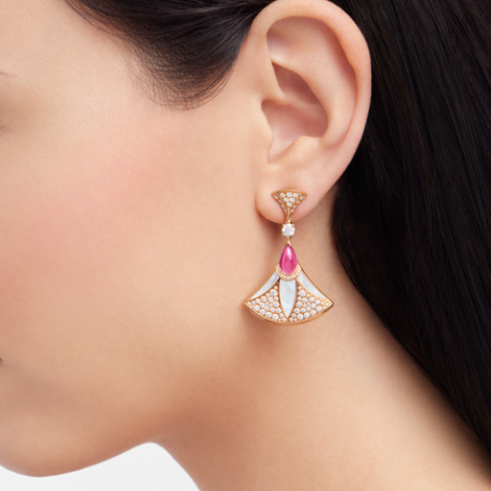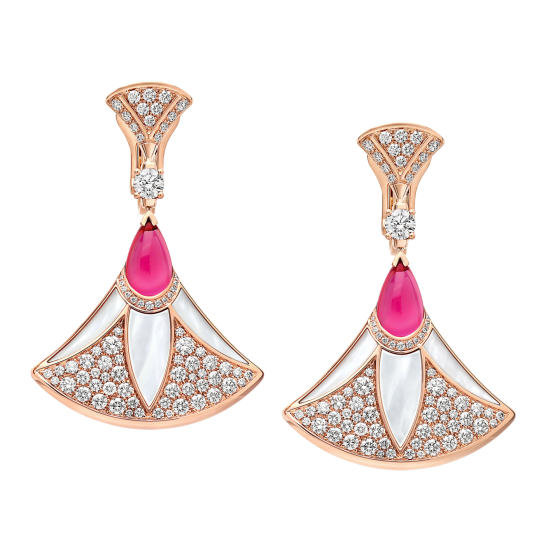 The DIVAS'DREAM series 18K rose gold necklace exquisitely interprets the charm of joyful women, with a dazzling and colorful design interpreting the iconic fan-shaped pattern. The iconic aesthetic elements of this series are embellished with diamonds and mother of pearl inlays, carefully cut to fit the intricate design, while two pear shaped red tourmalines elegantly adorn the gemstone mosaic pattern, showcasing BULGARI's inheritance of Roman culture to the fullest.