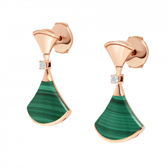 The DIVAS' DREAM series earrings embody Italian elegance and charm, unleashing the power of women with a mysterious and unforgettable temperament. The charming and exquisite ring is adorned with a fan-shaped pattern, inspired by the mosaic decoration of the BATHS OF CARACALLA in Rome, showcasing the historical connection between BVLGARI and the 'Eternal City' of Rome through modern fashion design and exquisite gemstone combinations. DIVAS' DREAM series 18K rose gold earrings set with malachite and round bright cut diamonds.