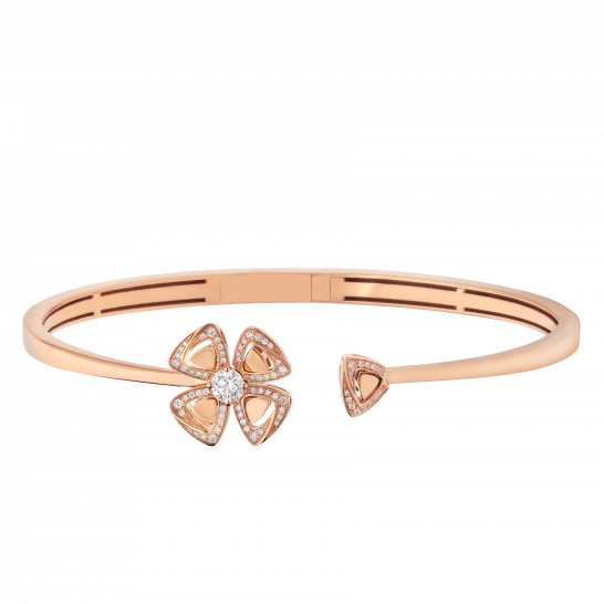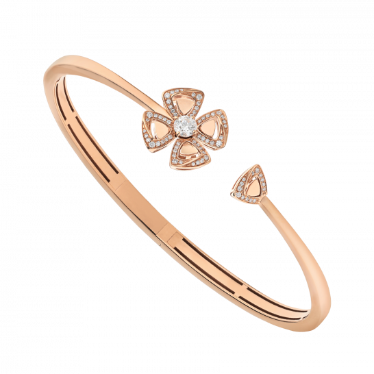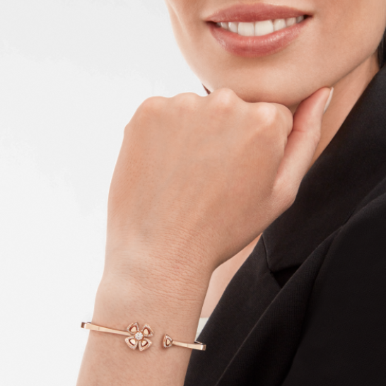 The FIOREVER collection blooms brilliantly in the 'Eternal City' of Rome, drawing inspiration from the charming four petal flowers cherished by the Romans, which symbolize happiness and joy. FIOREVER is composed of two meaningful words: FIORE (meaning flower in Italian) and FOREVER (meaning eternity in English), praising the Romans' love for life with passionate and stunning designs. The FIOREVER Wing Blossom series bracelet strolls around the wrist with fashionable and modern appearance lines, adorned with exquisite diamond flowers swaying in the wind, emitting a timeless and brilliant light. The FIOREVER Wing Blossom series bracelet is made of 18K rose gold material, set with a diamond and adorned with a diamond inlay.