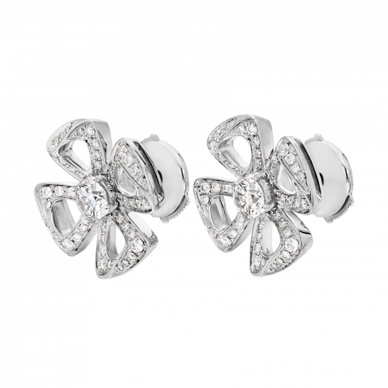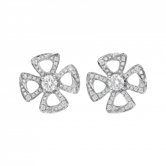 The FIOREVER collection blooms brilliantly in the 'Eternal City' of Rome, drawing inspiration from the charming four petal flowers cherished by the Romans, which symbolize happiness and joy. FIOREVER is composed of two meaningful words: FIORE (meaning flower in Italian) and FOREVER (meaning eternity in English), praising the Romans' love for life with passionate and stunning designs. The precious classic floral pattern of BVLGARI is adorned with four intricately set diamond hollow petals made of platinum, surrounded by a sparkling central diamond, blooming with eternal and brilliant radiance. The FIOREVER Wing Blossom series earrings are made of white 18K gold material, set with two diamonds and adorned with diamond inlay.