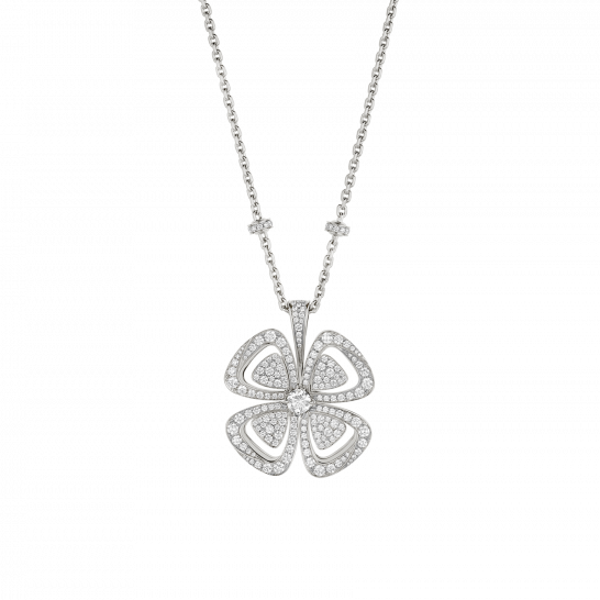 The FIOREVER series blooms brilliantly in the 'Eternal City' Rome, drawing design inspiration from the charming four-petal flower cherished by the Romans. This flower is a symbol of happiness and joy. FIOREVER is composed of two words with rich meanings: FIORE (meaning flower in Italian) and FOREVER (meaning eternity in English), praising the Romans' love of life with a passionate, free and casual design. The precious classic floral pattern is presented in a corolla made of high-quality diamonds, blooming with eternal brilliance. FIOREVER series white 18K gold necklace, set with a round brilliant-cut diamond and decorated with pavé diamonds.