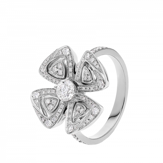 The FIOREVER series blooms brilliantly in the 'Eternal City' Rome, drawing design inspiration from the charming four-petal flower cherished by the Romans. This flower is a symbol of happiness and joy. FIOREVER is composed of two words with rich meanings: FIORE (meaning flower in Italian) and FOREVER (meaning eternity in English), celebrating the Romans' love of life with passionate and stunning designs. BVLGARI uses precious floral patterns to highlight the rich and multifaceted beauty of nature. Four rose gold diamond petals surround a central diamond, blooming with dazzling light. FIOREVER series ring, made of 18K rose gold, set with a diamond and decorated with pavé diamonds.