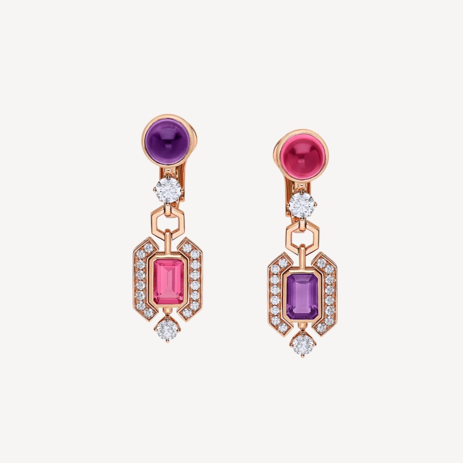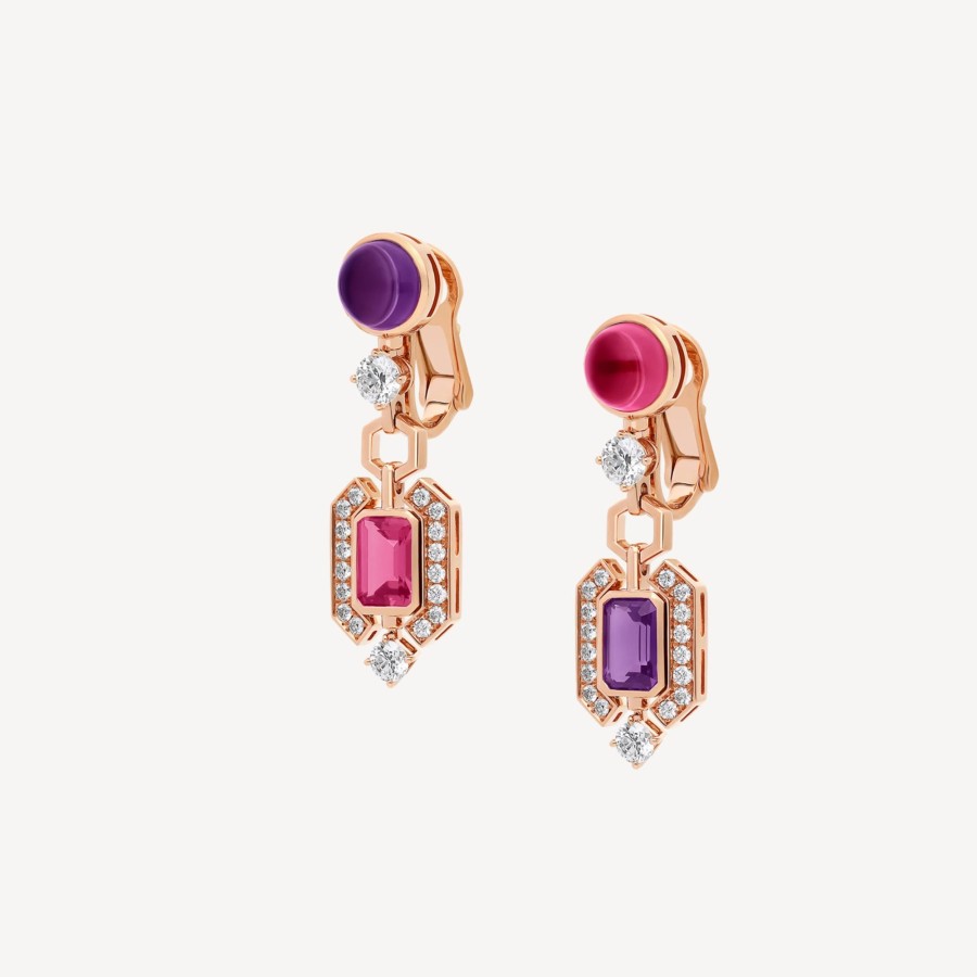 With Their Cocktail Of Bright Gemstones In A Multitude Of Shapes, The Mismatching Allegra Pendant Earrings In 18 Kt Rose Gold Embody Bulgari’S Exuberant And Bold Approach To Color. Expressing Joy Through Vibrant Nuances, This Effervescent Jewelry Creation Combines Smooth And Faceted Pink Tourmalines With Amethysts For A Harmonious Geometric Design Lit By Pavé Diamonds. An Interplay Of Cuts, Shapes, Colors And Lights That Suits The Need For Versatility Of Modern Women.