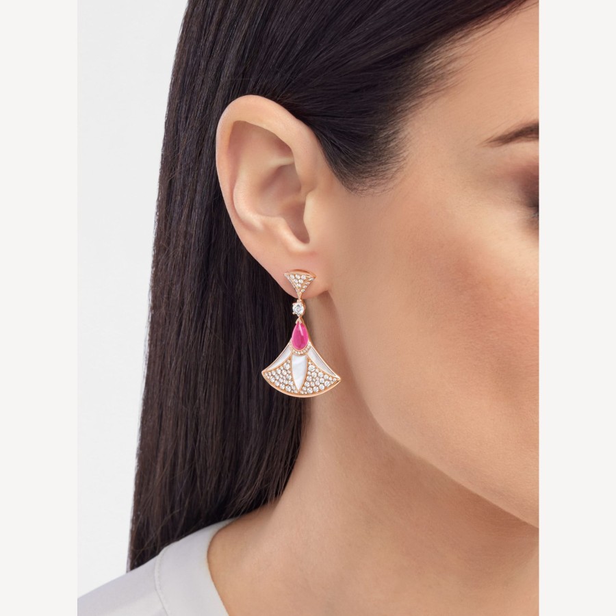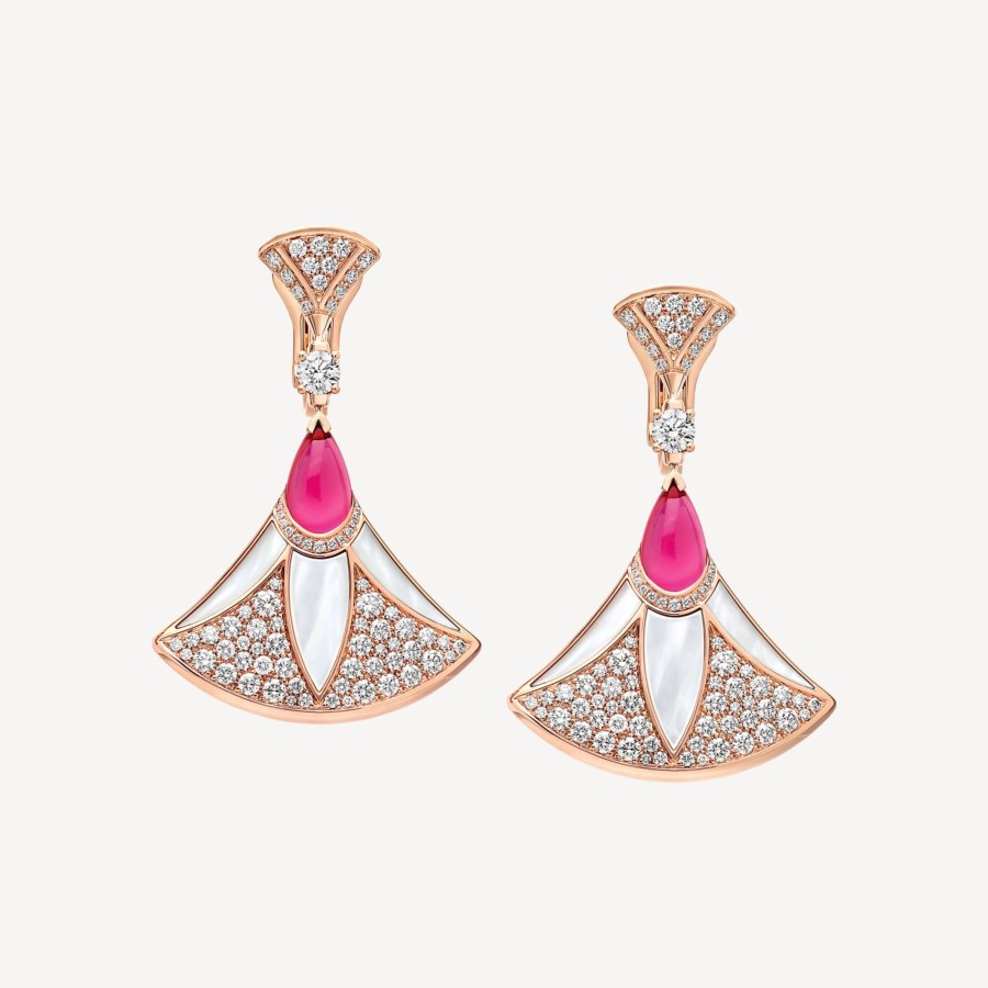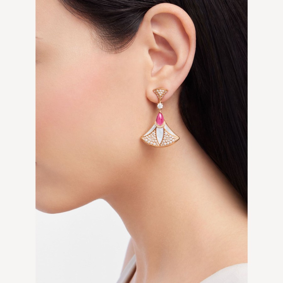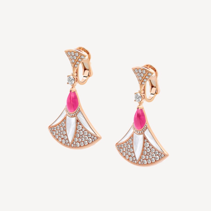 A Refined Expression Of Joyful Femininity, The Divas’ Dream 18 Kt Rose Gold Earrings Offer An Elegant And Colourful Interpretation Of The Iconic Fan-Shaped Motif. Deeply Rooted In Bulgari’S Roman Heritage, The Aesthetic Signature Of The Collection Is Embellished With Pavé Diamonds And Mother-Of-Pearl Inlays, Artfully Cut To Fit The Intricate Design, While Two Pear-Shaped Rubellites Top The Gemstone Mosaic. Evoking The Image Of A Blooming Flower, The Creation Is An Ode To Timeless Beauty.