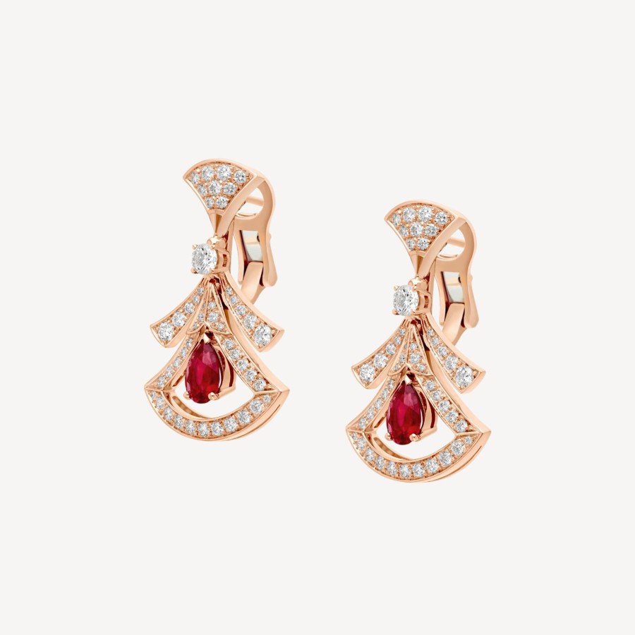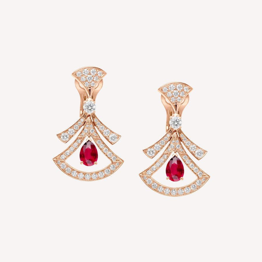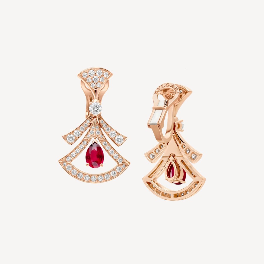 Embodying Italian Elegance, The Divas’ Dream Earrings Epitomises The Legacy Of A Diva, With Her Mysterious, Unforgettable Allure. Quintessentially Feminine And Refined, The Fan-Shaped Motif Draws Inspiration From The Colourful Mosaics Of The Roman Baths Of Caracalla, Reflecting Bvlgari’S Integral Bond With The Eternal City Through The Very Essence Of Italian Beauty. In A Play Between Full And Empty Displayed In Its Openwork Design, The Signature Shape Of The Collection Is Reinterpreted With A Light And Delicate Touch. Divas’ Dream 18 Kt Rose Gold Openwork Earrings With Pear-Shaped Rubies, Round Brilliant-Cut And Pavé Diamonds.