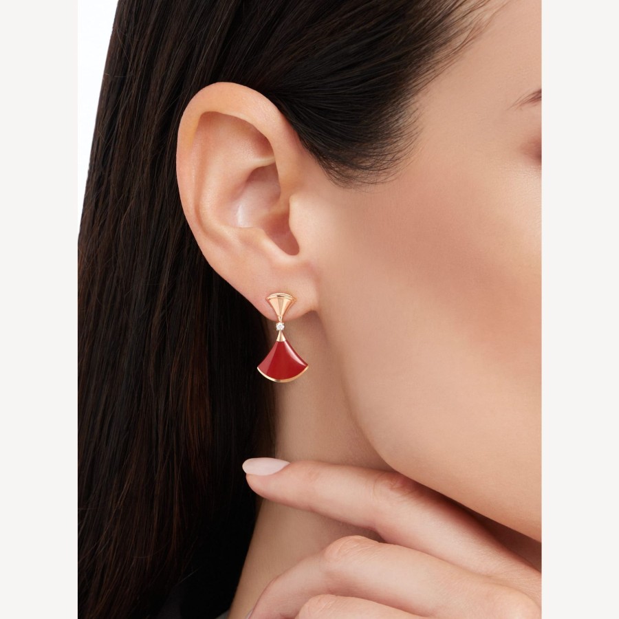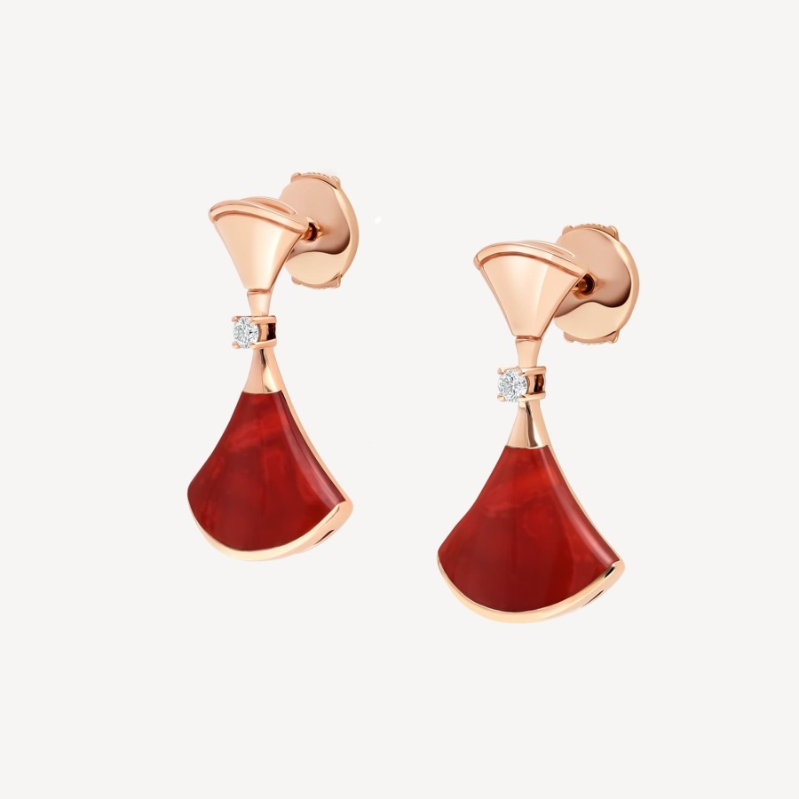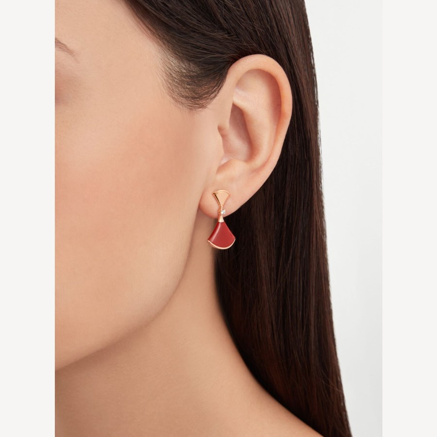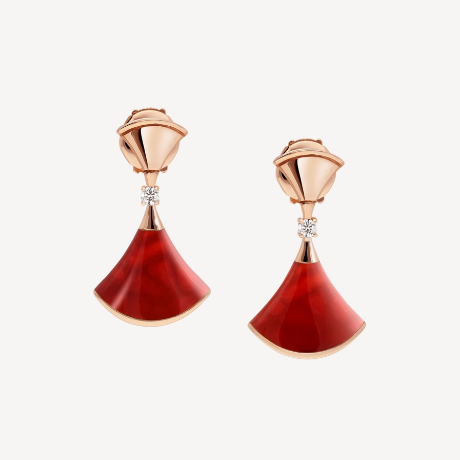 Embodying Italian Elegance, The Divas’ Dream Earrings Epitomizes The Legacy Of A Diva, With Her Mysterious, Unforgettable Allure. Quintessentially Feminine And Refined, The Earring’S Fan-Shaped Motif Draws Inspiration From The Mosaics Of The Roman Baths Of Caracalla, Reflecting Bvlgari’S Integral Bond With The Eternal City Through Modern Design And A Sophisticated Combination Of Gemstones. Divas’ Dream 18 Kt Rose Gold Earrings With Carnelian Inserts And Round Brilliant-Cut Diamonds.