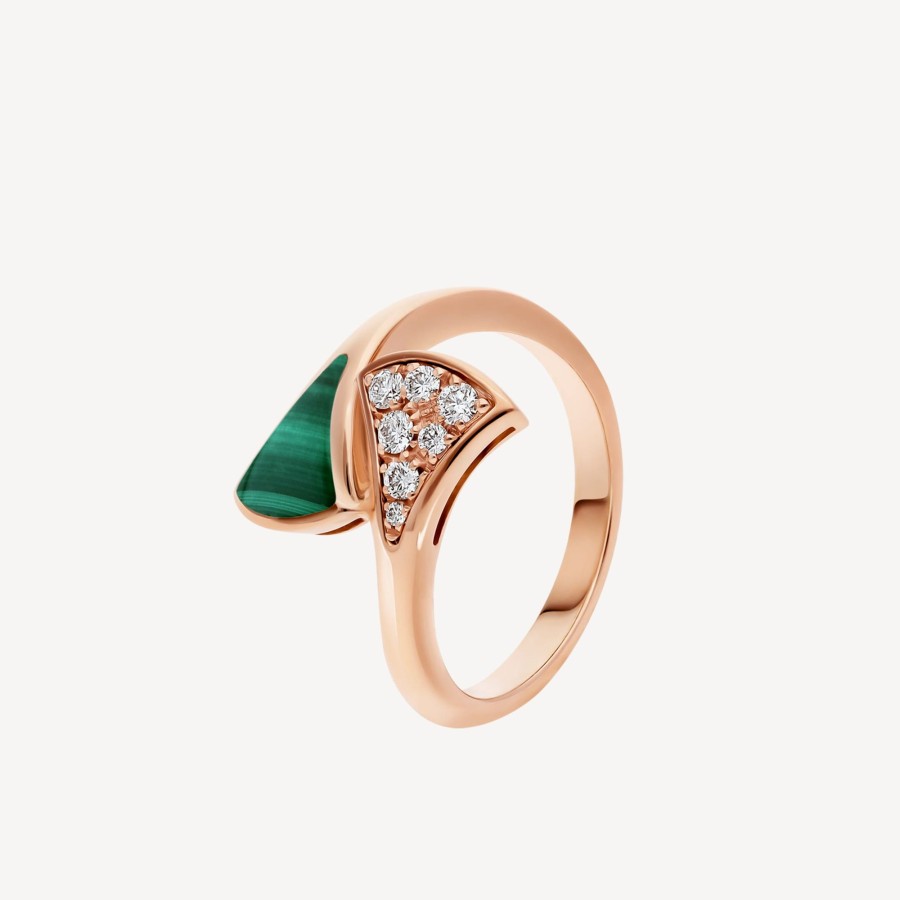 Embodying Italian Elegance, The Divas’ Dream Ring Represents The Legend Of A Diva, With Her Mysterious, Unforgettable Allure. Quintessentially Feminine And Refined, The Ring’S Fan-Shaped Motif Draws Inspiration From The Mosaics Of The Roman Baths Of Caracalla, Reflecting Bvlgari’S Integral Bond With The Eternal City Through A Modern Design And Sophisticated Combination Of Gemstones. Divas’ Dream 18 Kt Rose Gold Ring With Malachite Insert And Pavé Diamonds.
