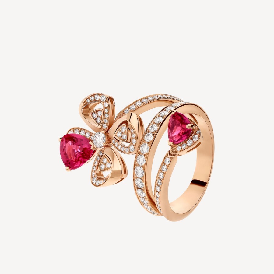 Blooming With Its Gem-Set Corolla, The Fiorever 18 Kt Rose Gold Ring Draws Inspiration From The Alluring Four-Petal Flower Cherished By The Romans As A Symbol Of Happiness And Joy. Embellished With The Timeless Elegance Of Precious Diamonds, The Floral Motif Is Animated By Bulgari’S Signature Touch Of Color, With Two Rubellite Petals Creating A Beautiful Interplay Of Volumes, Shapes And Reflections.