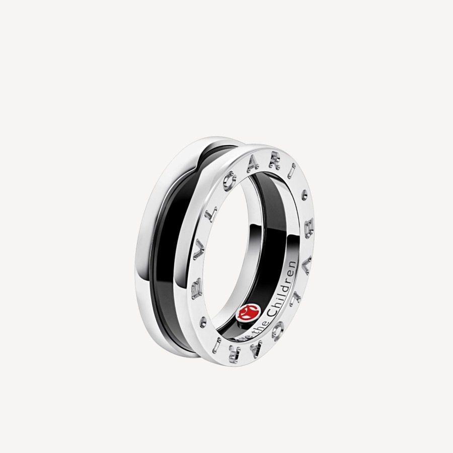 Inspired By The B.Zero1 Jewelry Collection, The Narrow Spinner Ring In 925 Sterling Silver And Black Ceramic Honors Bulgari’S Ongoing Philanthropic Partnership With Save The Children And Is Engraved With The Charity’S Logo. For Every Piece Of Bulgari’S Save The Children Jewelry Collection Sold, A Part Of The Proceeds Will Be Donated To Fund Programs That Provide Support And Opportunities To The World’S Most Vulnerable Children And Youth. Save The Children One-Band Sterling Silver Ring With Black Ceramic.