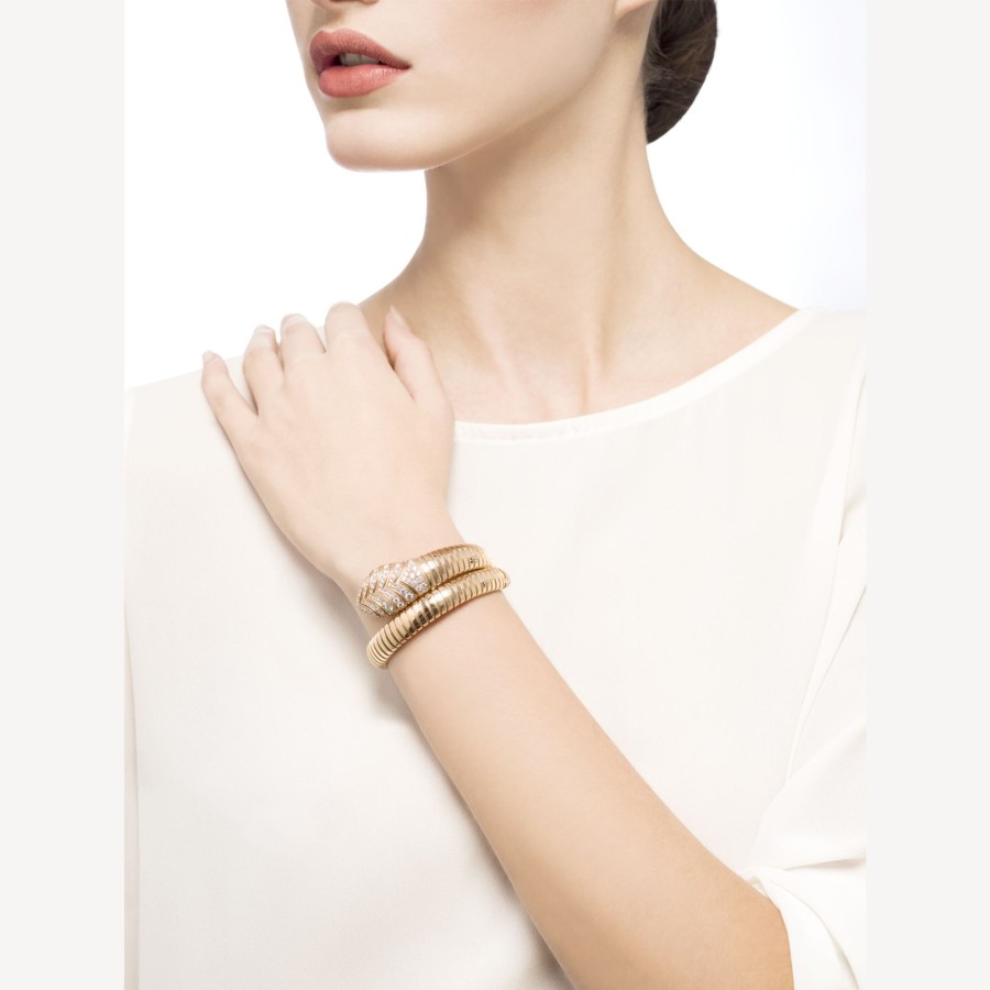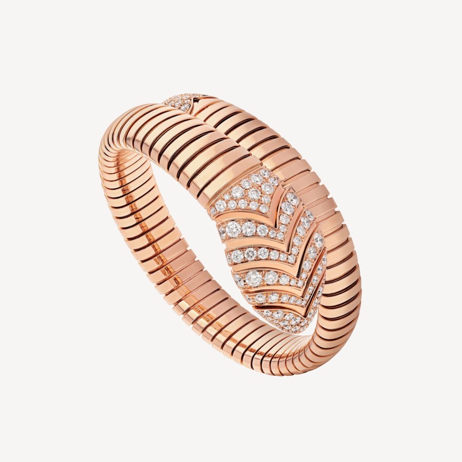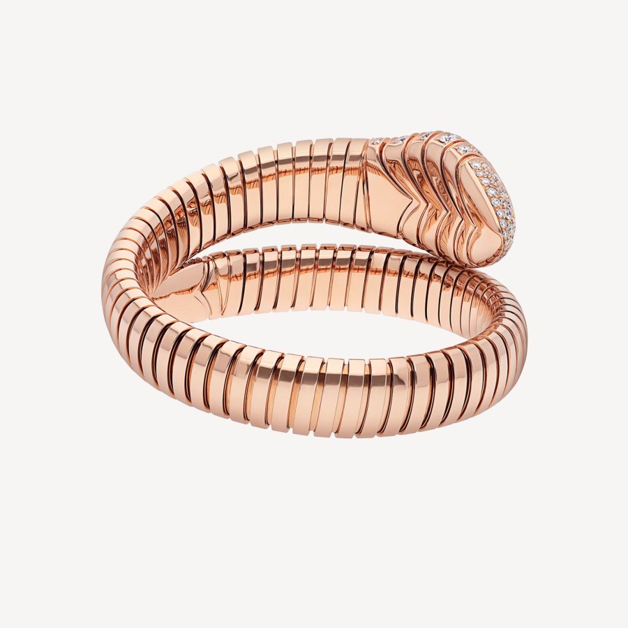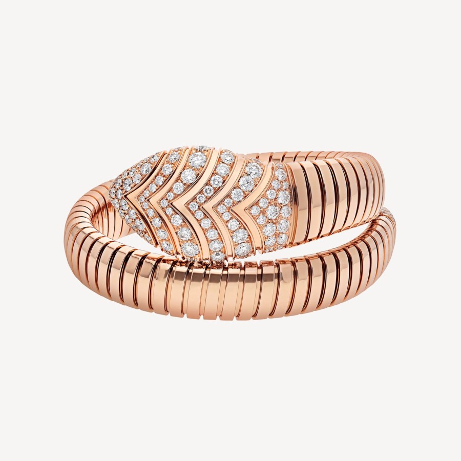Merging Two Of The Most Iconic Symbols Of Bulgari Design, The Serpenti Bracelet Coils The Sinuosity Of The Snake With The Contemporary Soul Of Tubogas. Evoking Both The Sensual Curves Of A Woman And The Fluid Shape Of The Serpent, The Bracelet Is Crafted With The Shapely Lines Of The Tubogas Technique, With A Flexible And Tubular Litheness. Radiating Glamour And A Truly Indivdual Style, This Serpenti Jewel Is Magnetic As Its Effortless. Serpenti Tubogas Bracelet In 18 Kt Rose Gold With Pavé Diamonds.