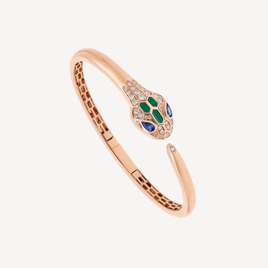 Capturing The Snake’S Innate Power Of Attraction, The Serpenti Bracelet Glorifies The Head Of The Mythical Animal Bringing Together Stylistic Audacity With Unrestrained Seduction. Inspired By The Sensuality Of A Woman’S Gaze, Bvlgari Recreates The Mesmerising Spell Of The Serpent, Focusing On The Magnetic Power Of The Eyes And Their Irresistible Ability To Seduce: Elegance With A Hint Of Danger. Serpenti 18 Kt Rose Gold Bracelet With Blue Sapphires, Malachite Inserts And Pavé Diamonds.