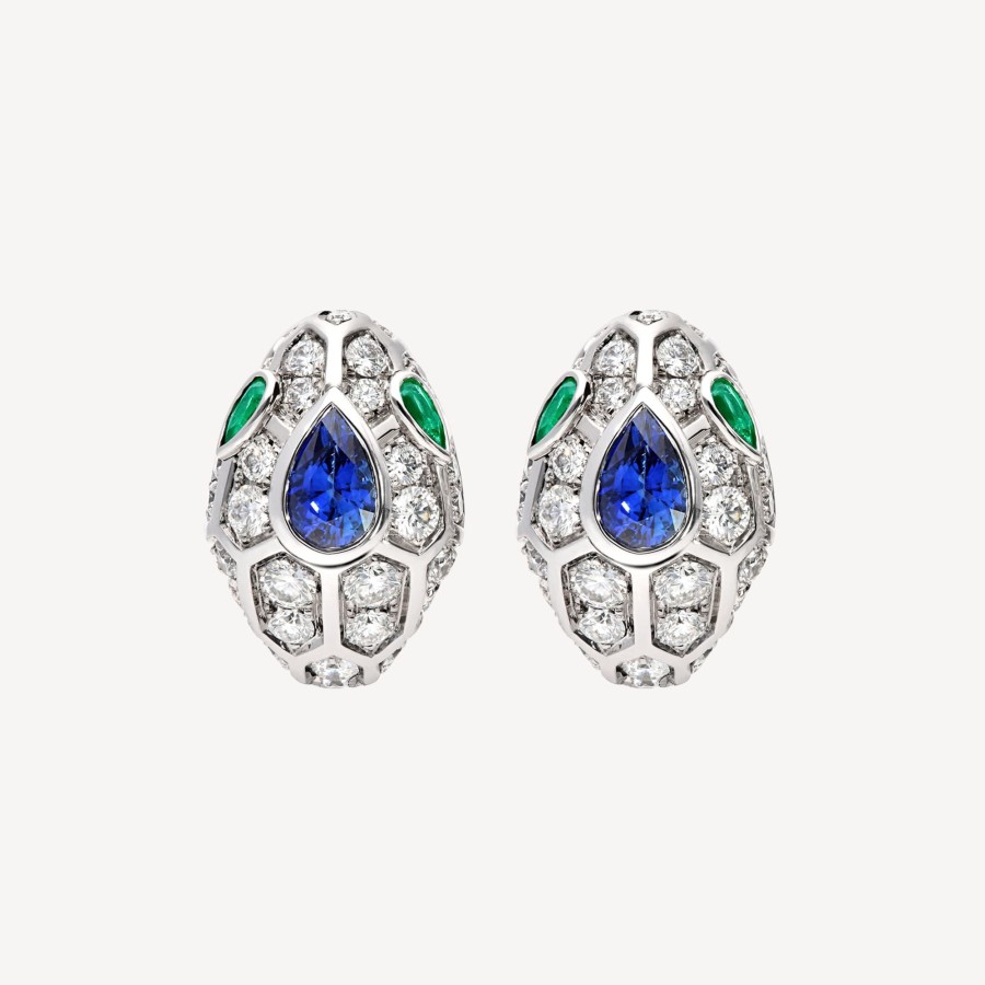 Capturing The Power Of Attraction, The Serpenti Earrings Glorify The Head Of The Snake In A Jewelled Design That Sparkles With Glamour And Sophistication. Inspired By The Sensuality Of A Woman’S Gaze, Bvlgari Reinterprets Its Spirit Animal, Focusing On The Magnetic Power Of The Eyes And Channelling Their Irresistible Ability To Seduce. The Voluptuous Sapphire That Crowns The Snakehead Is Testament To Bvlgari’S Craftsmanship With Coloured Gemstones: Elegance With A Hint Of Danger. Serpenti Earrings In 18 Kt White Gold With Blue Sapphire, Emeralds And Pavé Diamonds.
