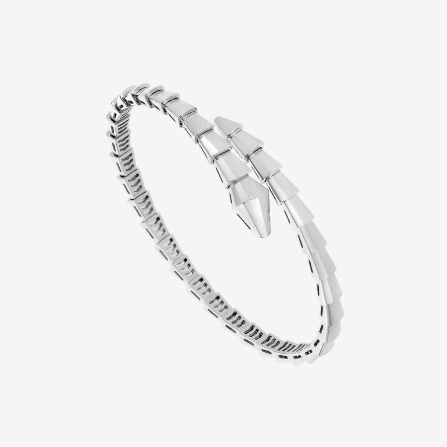 An Ultra-Modern Interpretation Of Bulgari’S Icon Of Endless Metamorphosis And Unstoppable Transformation, The Serpenti Viper 18 Kt White Gold Bracelet Enchants With The Stark Simplicity And Sleek Sensuality Of Its Hypnotic Design. A Blend Of Sinuous Shapes And Geometric Flair, The Bracelet Coils Around The Wrist With The Essential Beauty Of Its Unmistakable Scales.