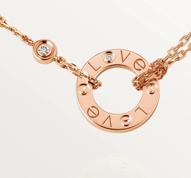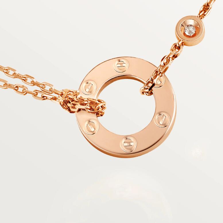 LOVE  necklace, 18K rose gold, set with 2 brilliant-cut diamonds totaling 0.03 carats. Inner diameter 7.8mm. Chain length: 392mm.