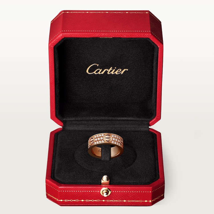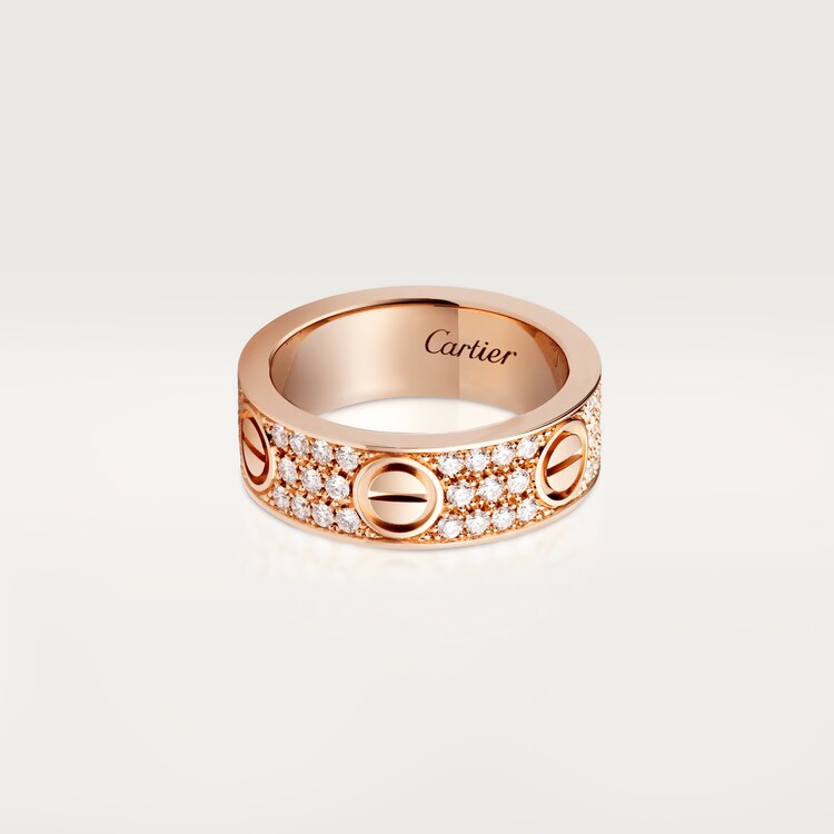 LOVE ring, 18K rose gold (750/1000), set with 66 brilliant-cut diamonds totaling 0.70 carat. Width: 6.5 mm (for size 52).