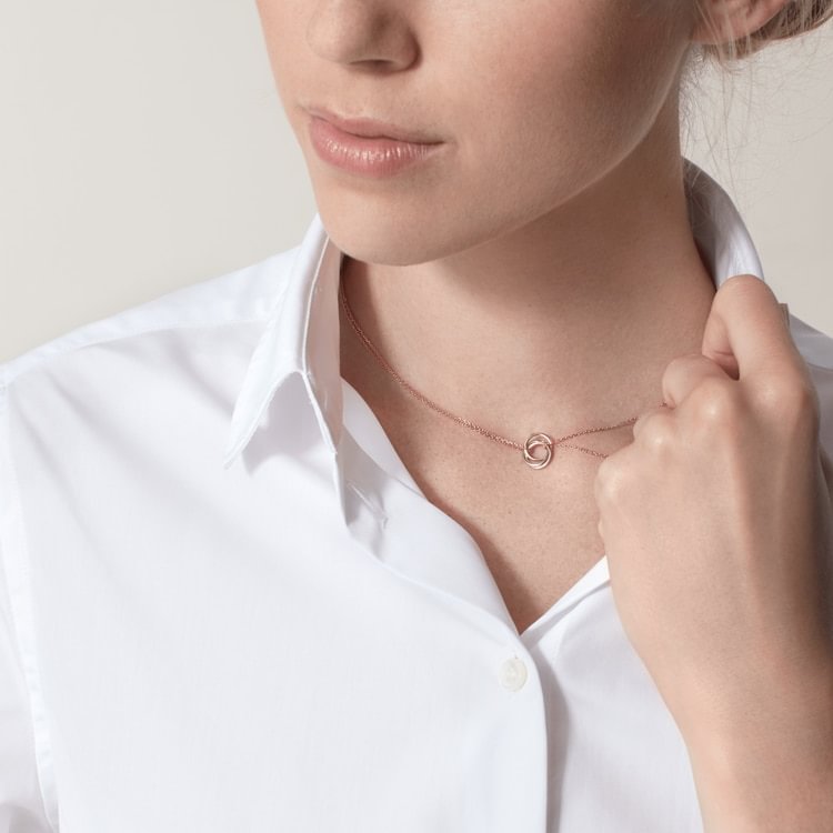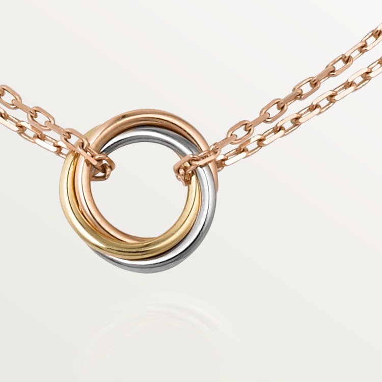Trinity necklace, 18K white gold (750/1000), 18K rose gold (750/1000), 18K yellow gold (750/1000), 18K rose gold (750/1000) chain. Inner diameter: 7.3 mm. Neck size: 36-38-40.