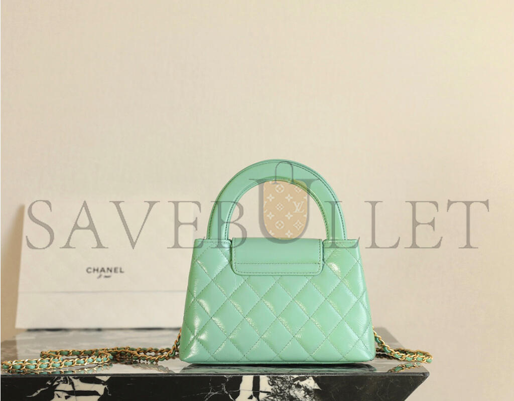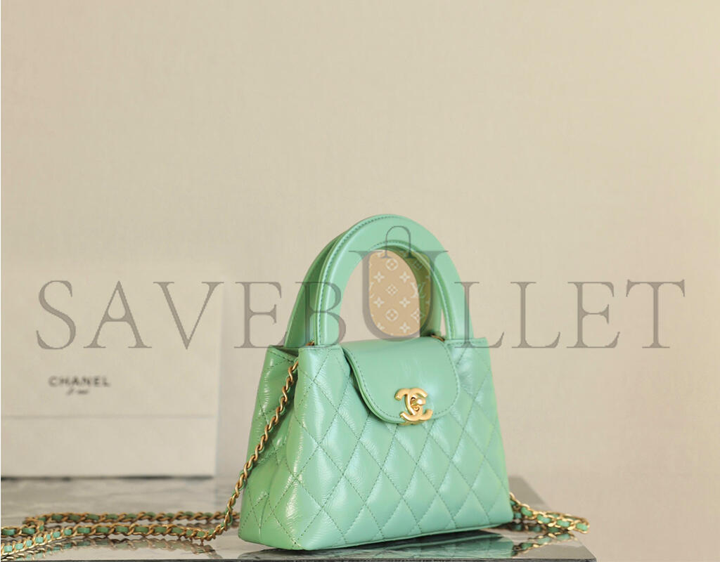CHANEL MASTER KELLY SHOPPER LIGHT GREEN SHINY CALFSKIN BRUSH GOLD HARDWARE (19*13*7cm)