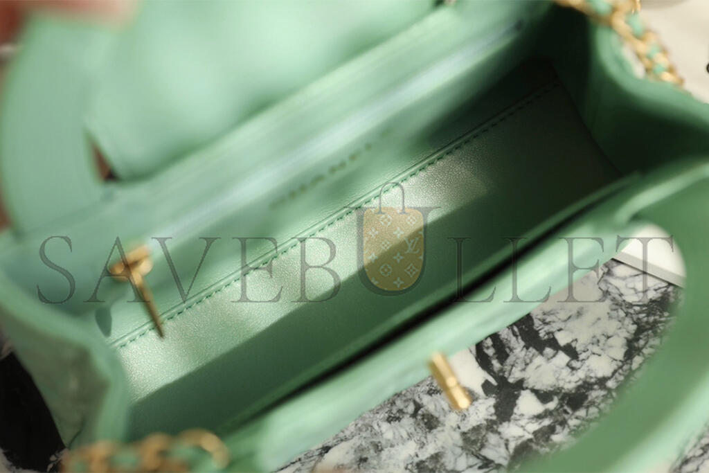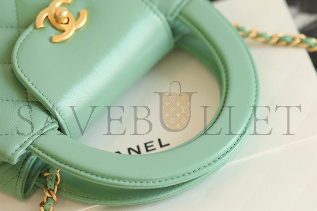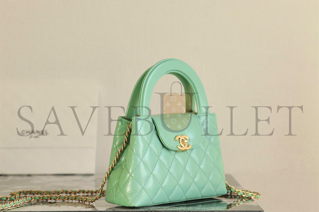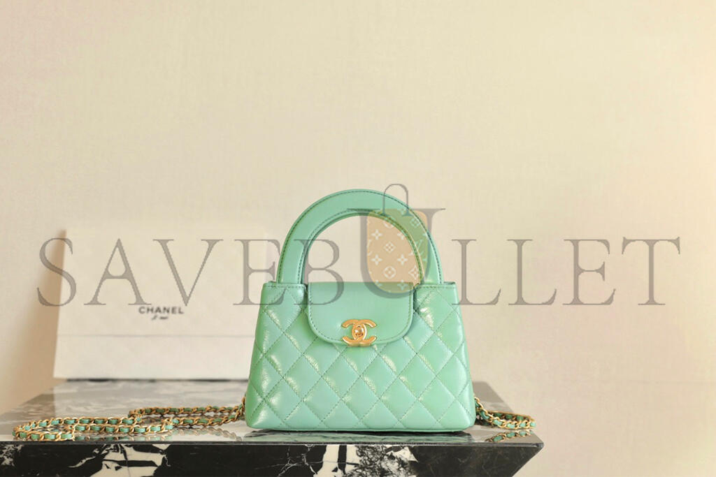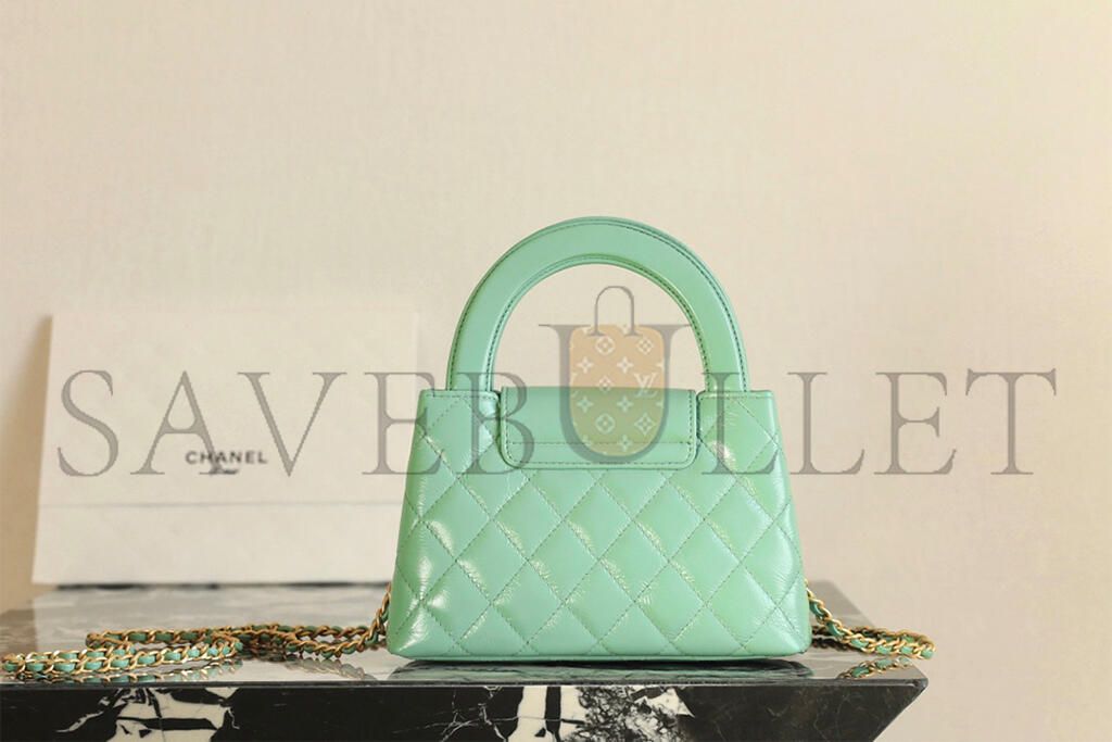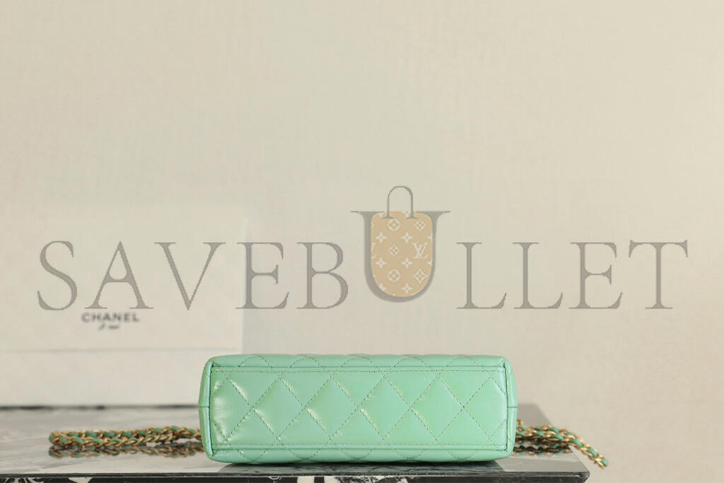 • CHANEL MASTER KELLY SHOPPER LIGHT GREEN SHINY CALFSKIN BRUSHED GOLD HARDWARE AS4416 (19*13*7cm)