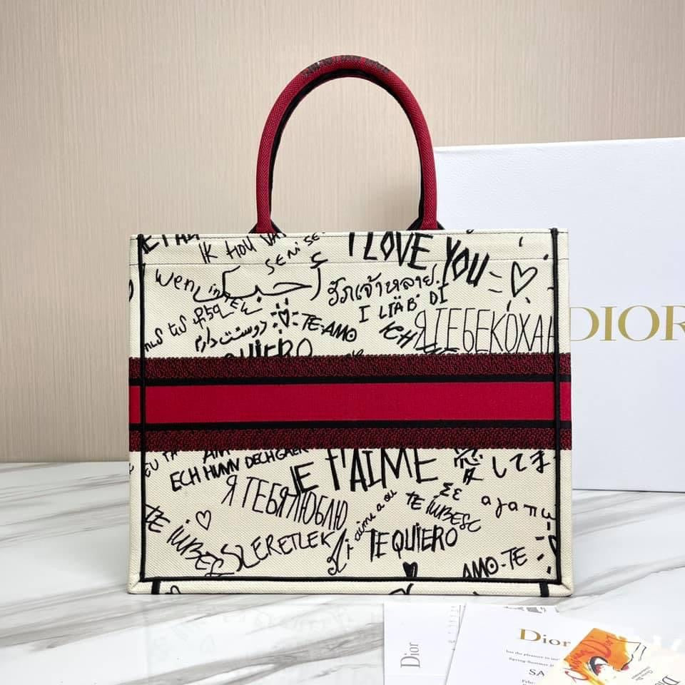 Introduced by Maria Grazia Chiuri, Creative Director of Christian Dior, the Dior Book Tote has become a staple of the Dior aesthetic. Designed to hold all the daily essentials, the black style is fully embroidered with a white Dior Around the World motif, further embellished with a play on shiny and matte thread. The design is adorned with the 'CHRISTIAN DIOR' signature on the front and exemplifies the House's signature savoir-faire. The tote may be carried by hand or worn over the shoulder.