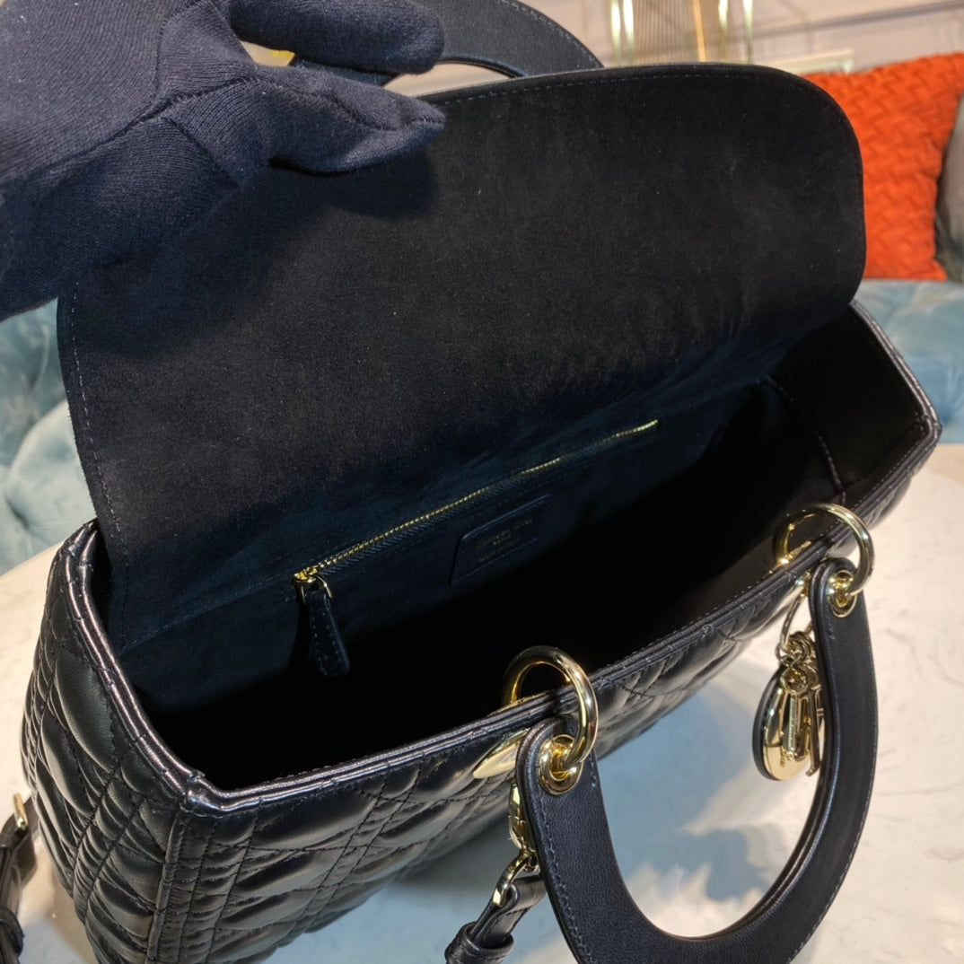 The Lady Dior handbag epitomizes the House's vision of elegance and beauty. Sleek and refined, the timeless yet relevant style is crafted in white ultramatte calfskin with Cannage stitching, creating the instantly recognizable quilted texture. The tonal metal 'D.I.O.R.' charms offer an elegant allure. Featuring a thin, removable leather shoulder strap, the large Lady Dior bag can be carried by hand, worn over the shoulder or crossbody.