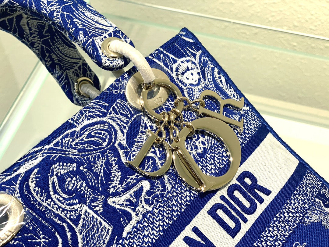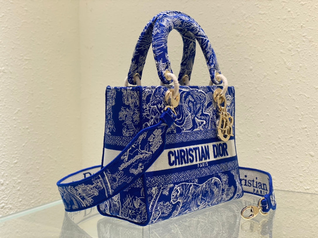 The Lady D-Lite bag combines classic elegance with House modernity. Part of the Dioriviera 'CHRISTIAN DIOR PARIS' signature on the front, while 'D.I.O.R.' charms in pale gold-finish metal enhance and illuminate the silhouette. Equipped with a wide reversible and removable embroidered shoulder strap, the medium Lady D-Lite bag can be carried by hand or worn crossbody, and can be coordinated with other Dioriviera creations.