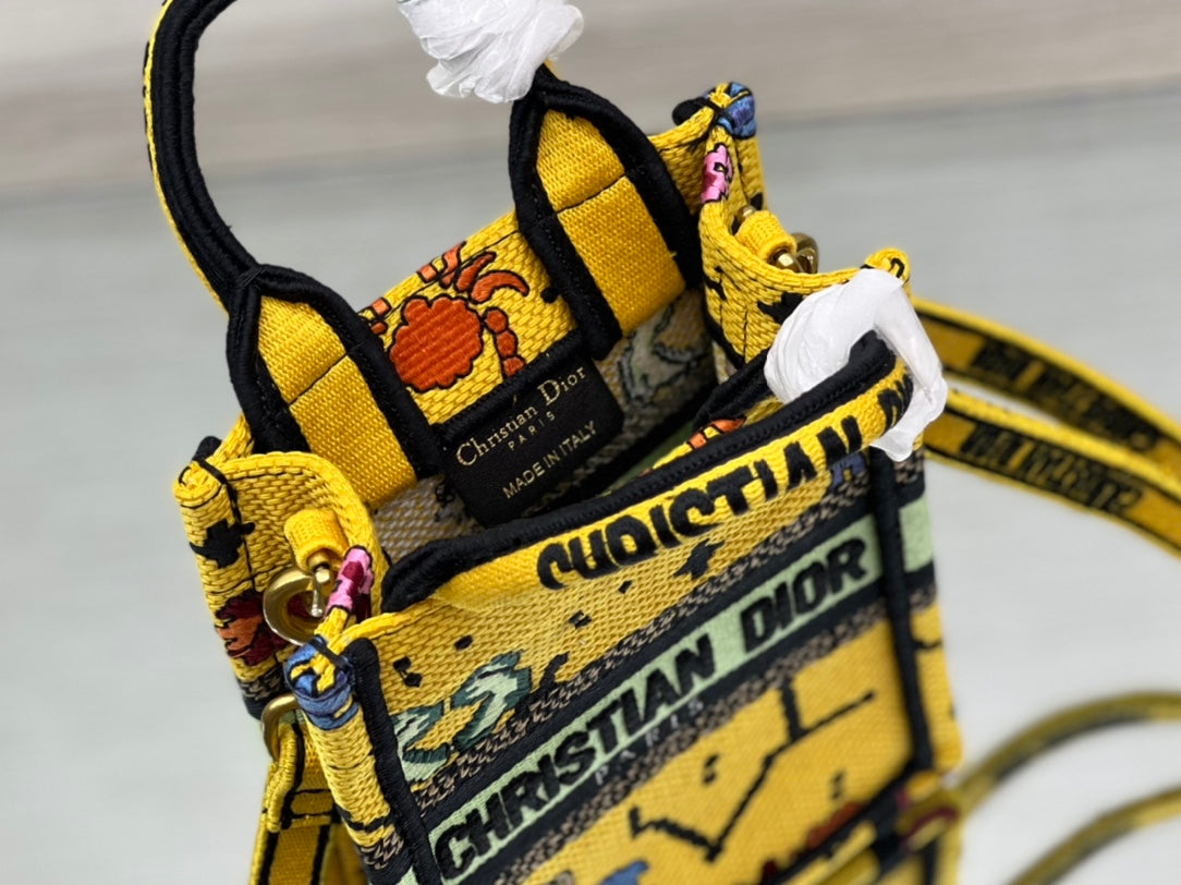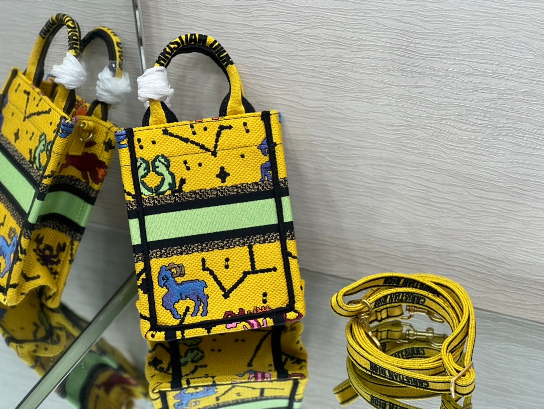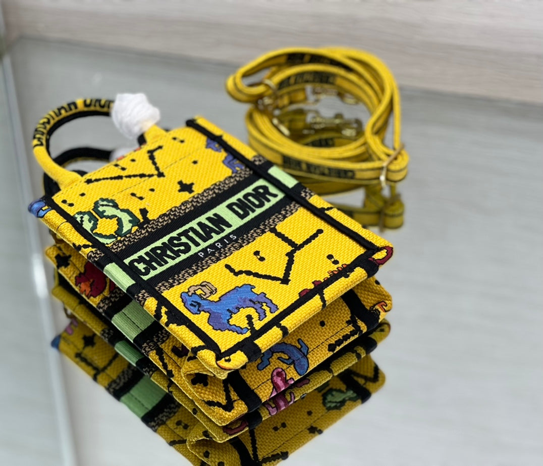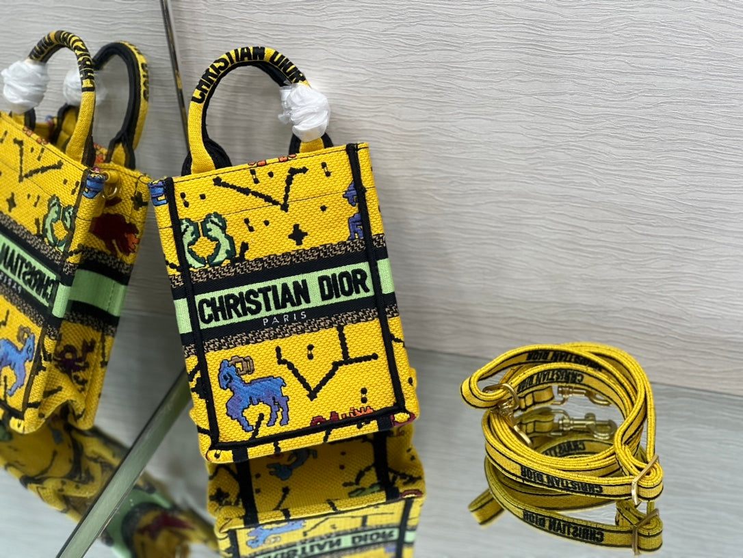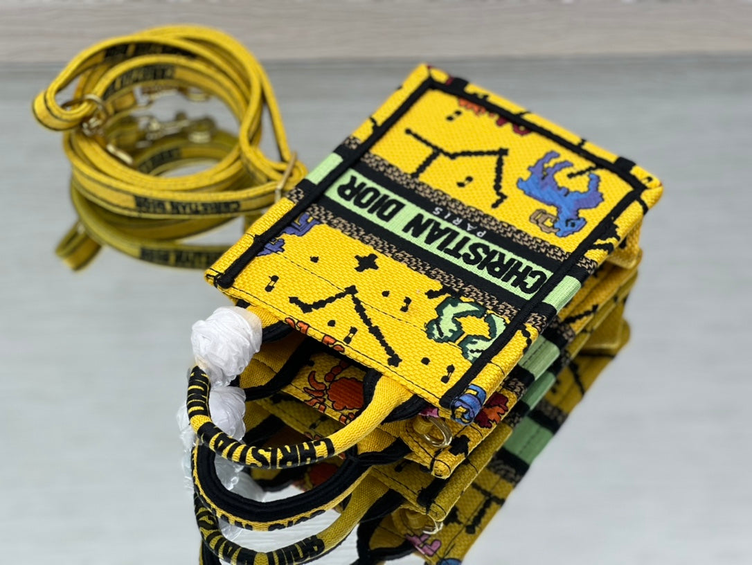 Maria Grazia Chiuri's phone bag enriches the iconic Dior Book Tote line with an ideal example of the House's savoir-faire. The yellow style is entirely embroidered with the multicolor Dior Pixel Zodiac motif, offering a new take on astrological signs in a whimsical and colorful universe. Enhanced by the 'CHRISTIAN DIOR PARIS' signature on the front, the miniature bag will accommodate a phone as well as the small daily essentials. Completed by an adjustable and removable embroidered shoulder strap, the modern accessory can be carried by hand, worn over the shoulder or crossbody.