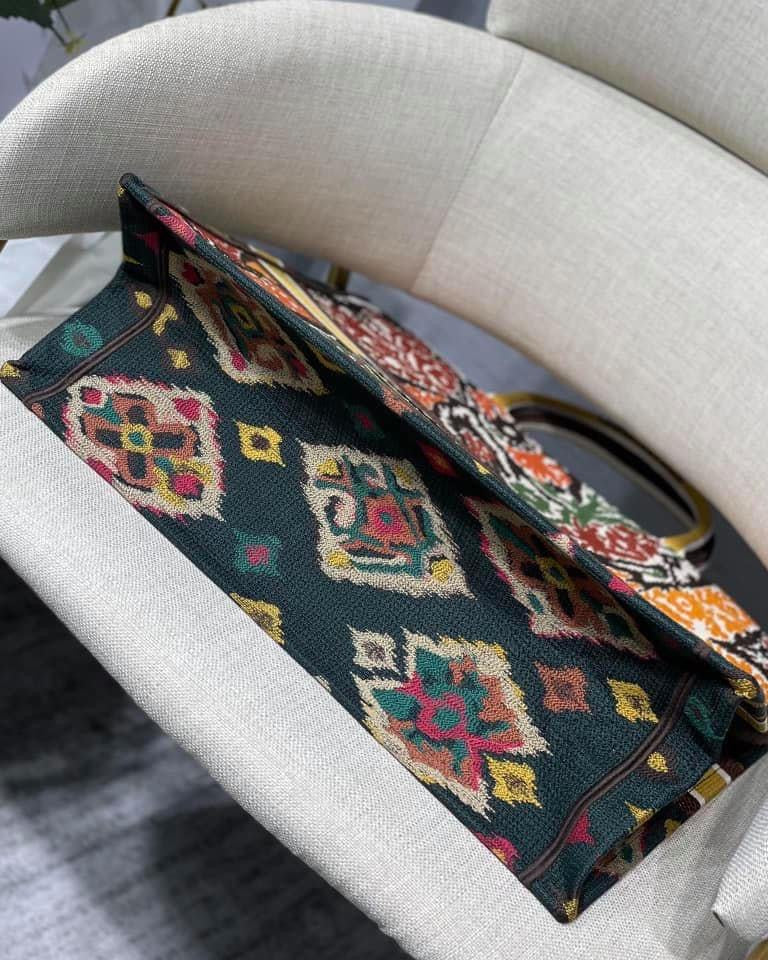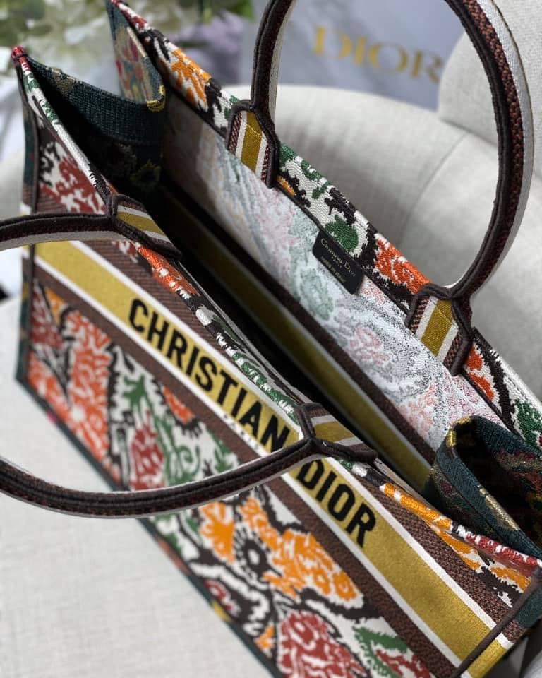 The Dior Book Tote, an original style introduced by Creative Director Maria Grazia Chiuri, has become a staple of the Dior aesthetic. Designed to carry all the daily essentials, the silhouette is fully embroidered with a multicolor and heathered-effect Dior Paisley motif. The front boasts a 'Christian Dior' signature while a tonal graphic motif adorns the sides for a contrasting modern touch. The carryall is a prime example of Dior savoir-faire.