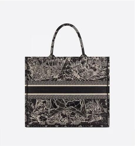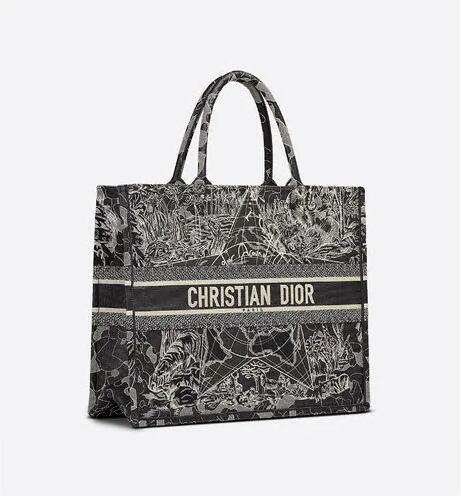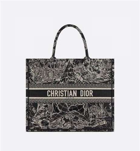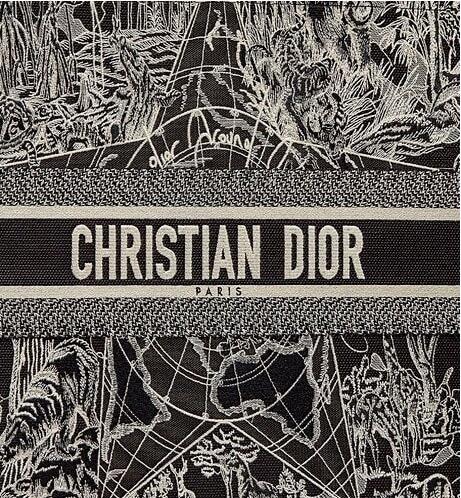 Introduced by Maria Grazia Chiuri, Creative Director of Christian Dior, the Dior Book Tote has become a staple of the Dior aesthetic. Designed to hold all the daily essentials, the black style is fully embroidered with a white Dior Around the World motif, further embellished with a play on shiny and matte thread. The design is adorned with the 'CHRISTIAN DIOR' signature on the front and exemplifies the House's signature savoir-faire. The tote may be carried by hand or worn over the shoulder.