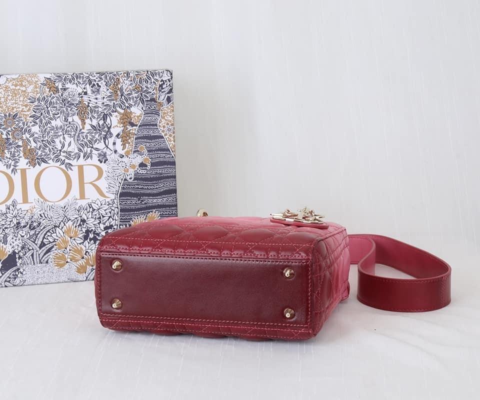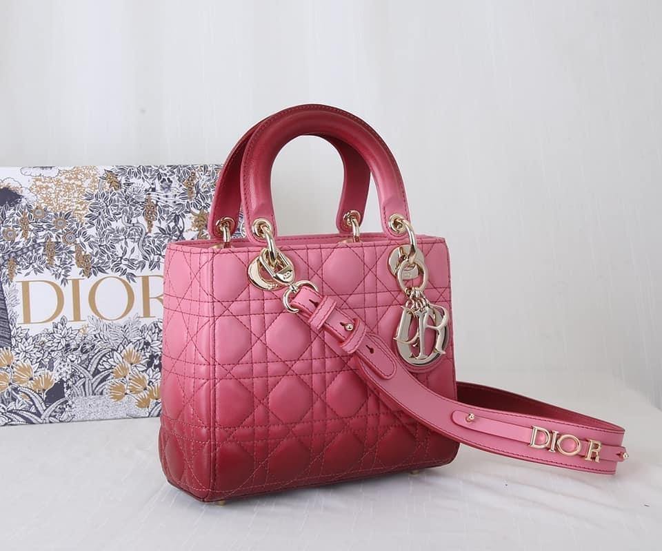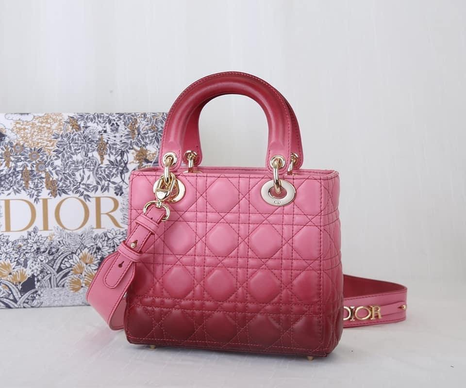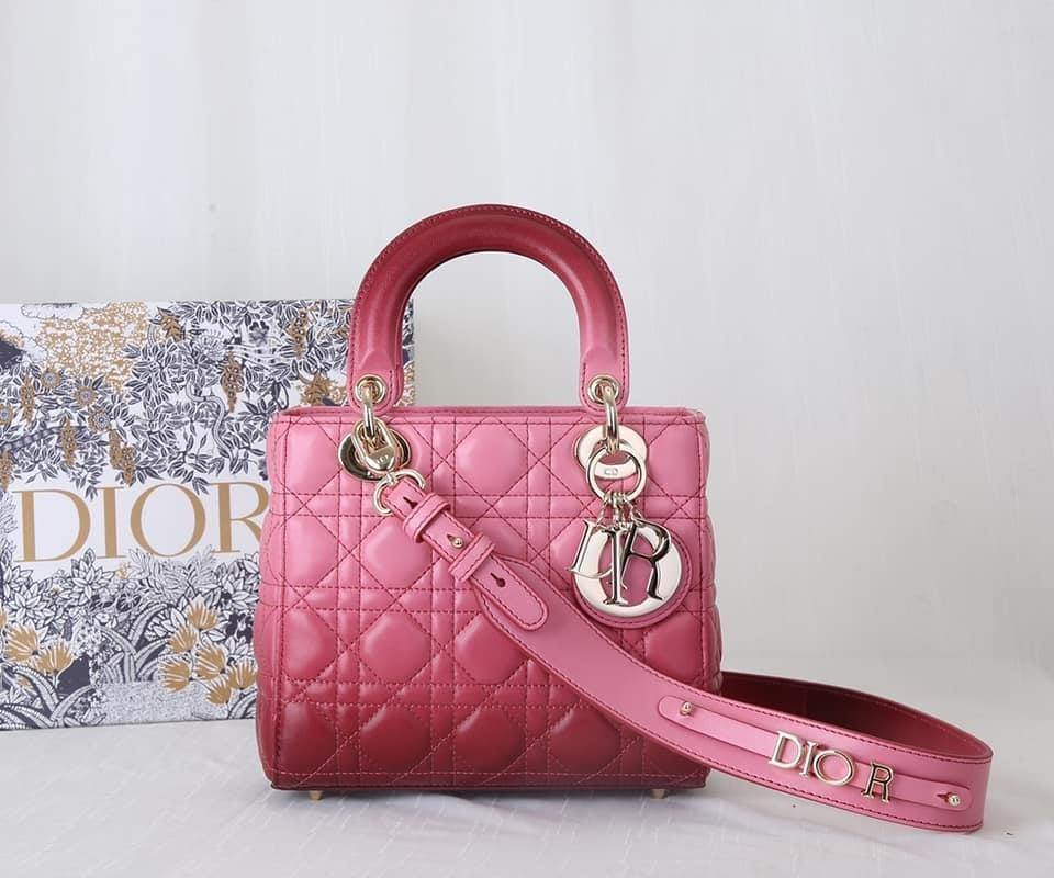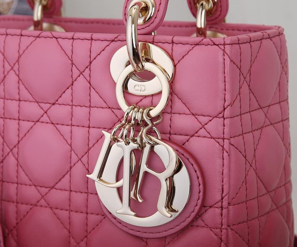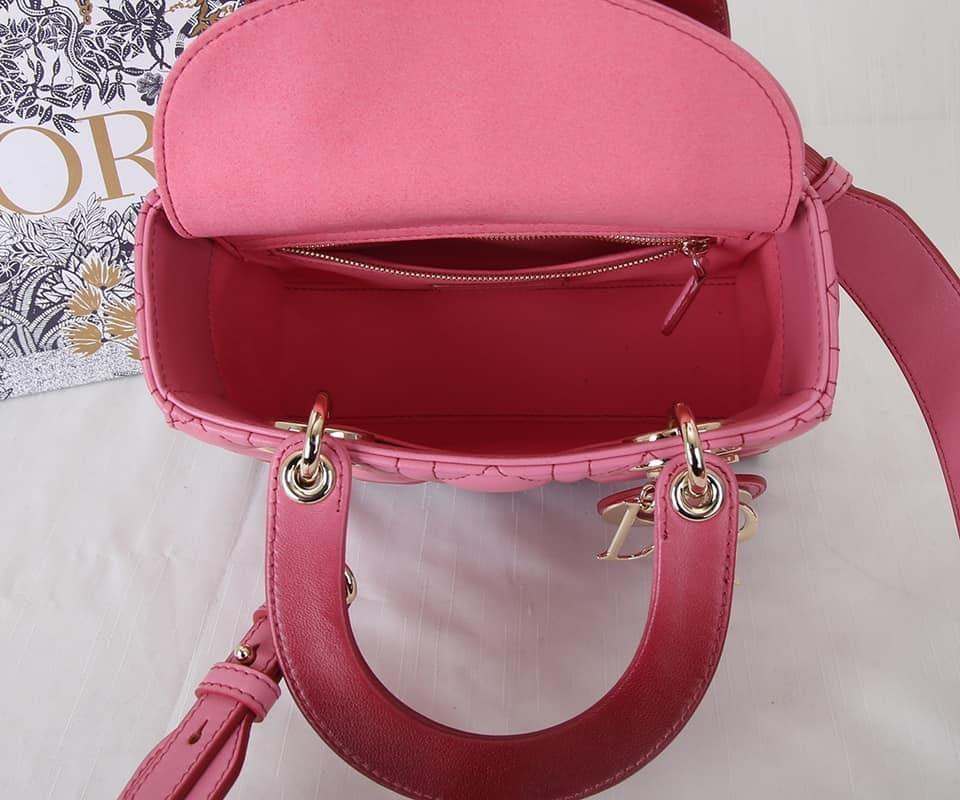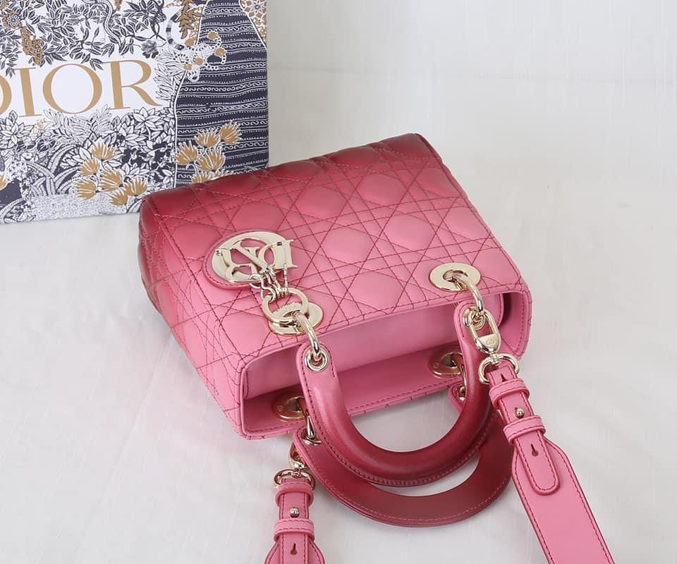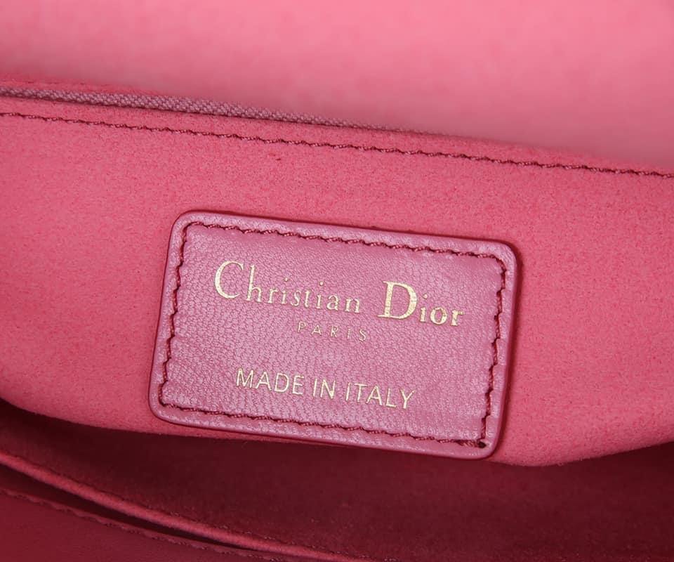 The Lady Dior My ABCDior bag epitomizes Dior's vision of elegance and beauty. A sleek, refined bag, it is timeless yet modern. This season, the style is crafted with strawberry pink lambskin and covered with the iconic Cannage stitching, embellished with a gradient finish. The pale gold-finish metal 'D.I.O.R.' charms further enhance its silhouette. The unique design may be personalized with pins placed on its shoulder strap.