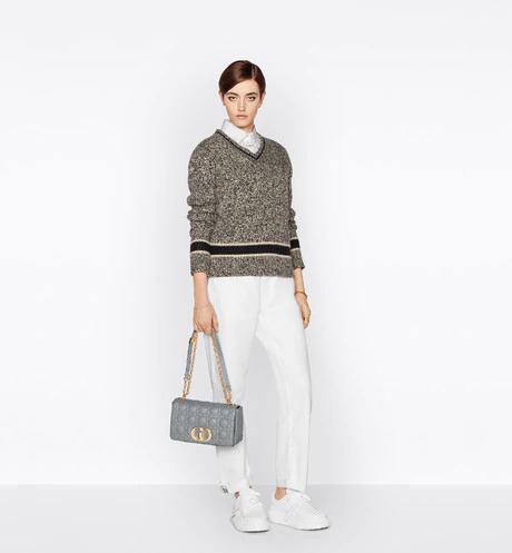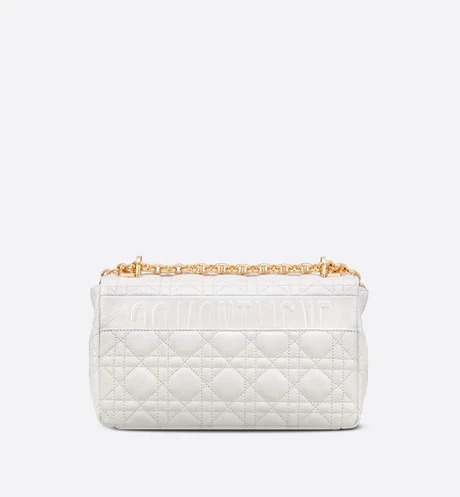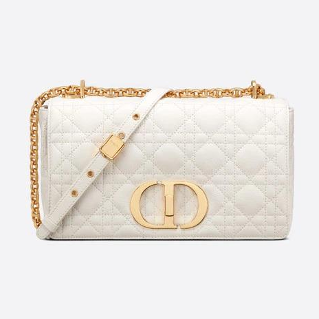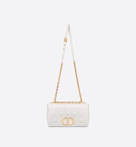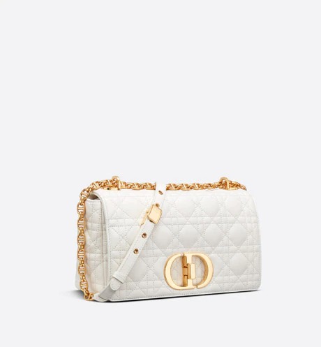 The Dior Caro bag combines modernity with timeless elegance. The medium silhouette is crafted in ivory calfskin with Cannage topstitching. The supple bag features a flap adorned with an antique gold-finish metal 'CD' twist clasp, inspired by the seal of a Christian Dior perfume bottle. The detachable chain shoulder strap with 'CD' signature links allows the bag to be carried by hand or worn over the shoulder and may be replaced by one of the House's wide embroidered straps for day or evening attire wear.