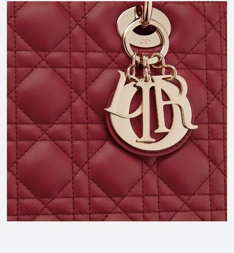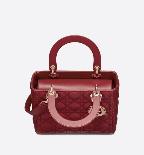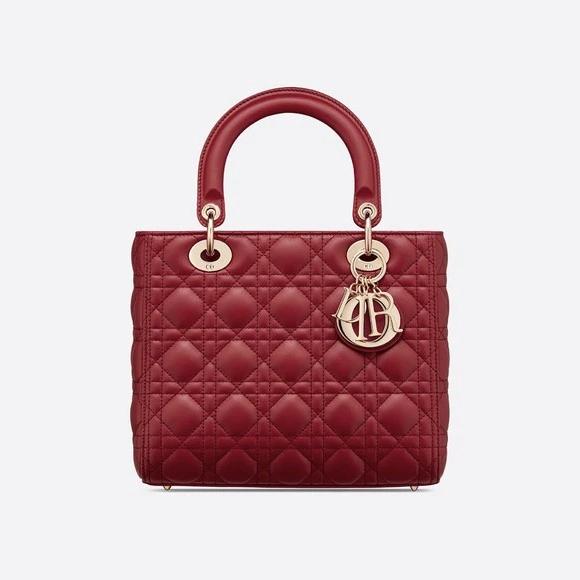 The Lady Dior handbag epitomizes the House's vision of elegance and beauty. Sleek and refined, the timeless yet relevant style is crafted in cherry red lambskin with Cannage stitching, creating the instantly recognizable quilted texture. The pale gold-finish metal signature 'D.I.O.R.' charms offer an elegant allure. Featuring a thin, removable leather shoulder strap, the medium Lady Dior bag can be carried by hand, worn over the shoulder or crossbody.
