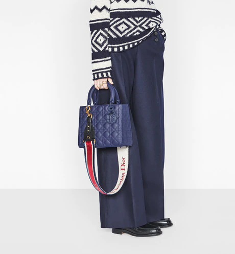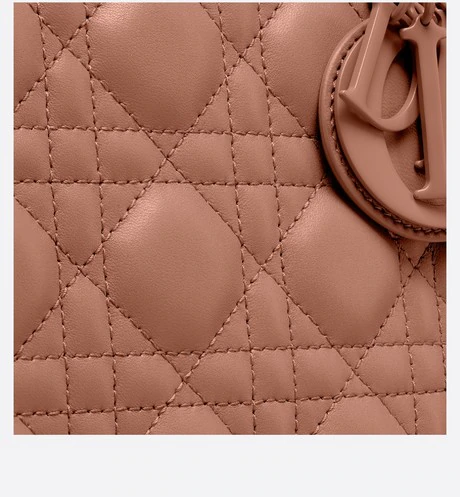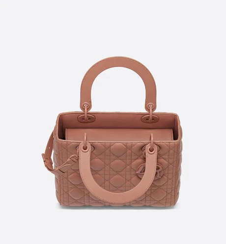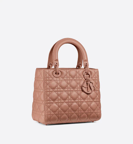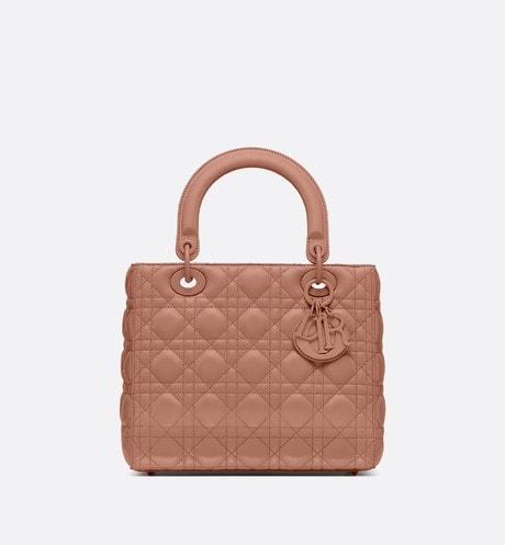 The Lady Dior handbag epitomizes the House's vision of elegance and beauty. Sleek and refined, the timeless yet relevant style is crafted in blush ultramatte calfskin with Cannage stitching, creating the instantly recognizable quilted texture. The tonal metal 'D.I.O.R.' charms complete and illuminate the silhouette. Featuring a thin, removable leather shoulder strap, the medium Lady Dior bag can be carried by hand, worn over the shoulder or crossbody.