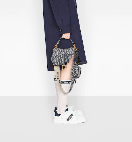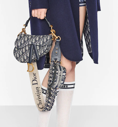 Maria Grazia Chiuri brings a fresh update to the iconic Saddle bag. The design is fully embroidered with the House's hallmark blue Dior Oblique motif. The legendary style features a Saddle flap with a magnetic 'D' stirrup clasp and boasts an antique gold-finish metal 'CD' signature on each side of the handle. The bag can be carried by hand or worn over the shoulder and may be customized with different shoulder straps.