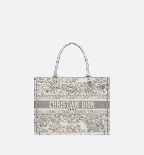 The Dior Book Tote is an original creation introduced by Dior's Creative Director, Maria Grazia Chiuri, and has become a staple of the Dior aesthetic. Designed to hold all the daily essentials, it is fully embroidered with a gray Toile de Jouy motif and adorned with a 'CHRISTIAN DIOR' signature on the front. The small tote exemplifies the House's signature savoir-faire and may be carried by hand or worn over the shoulder.