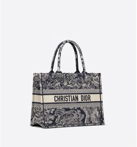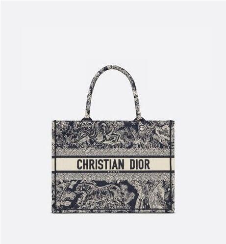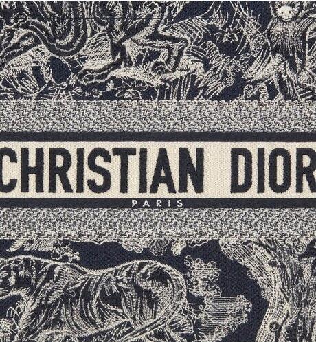 Introduced by Maria Grazia Chiuri, Creative Director of Christian Dior, the Dior Book Tote has become a staple of the Dior aesthetic. Designed to hold all small daily essentials, the style has been fully embroidered with a blue Toile de Jouy Reverse motif, a variation of the House's hallmark pattern with a play on reversed colors. Adorned with the 'CHRISTIAN DIOR' signature on the front, the small tote exemplifies the House's signature savoir-faire and may be carried by hand or worn over the shoulder.