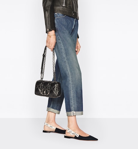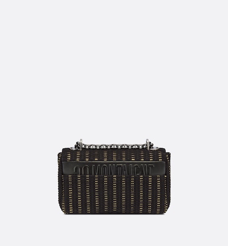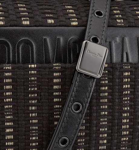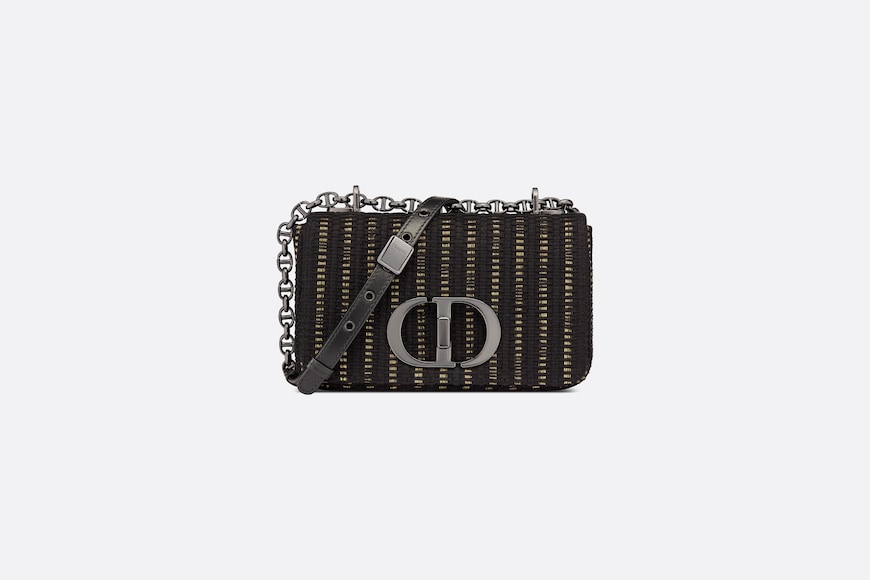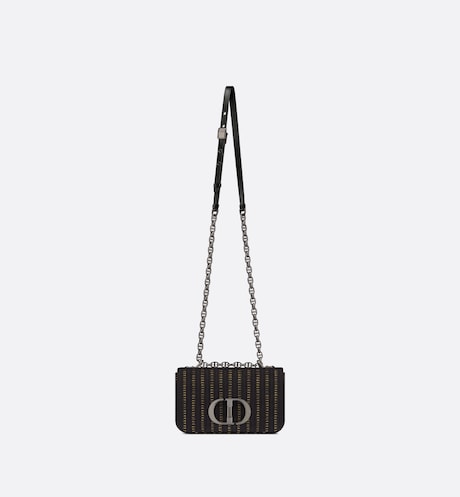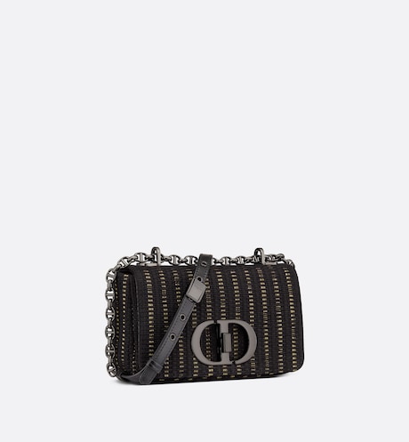 The Dior Caro bag combines modernity with timeless elegance. Demonstrating the House's unique savoir-faire, the style is crafted in black upcycled silk, woven by hand and embellished with gold-tone metallic thread. The design features a flap adorned with a ruthenium-finish metal 'CD' twist clasp, inspired by the seal of a Christian Dior perfume bottle. The detachable chain shoulder strap with 'CD' signature links allows the small bag to be carried by hand or worn over the shoulder or crossbody, or be replaced by one of the House's wide embroidered straps for day or evening attire.