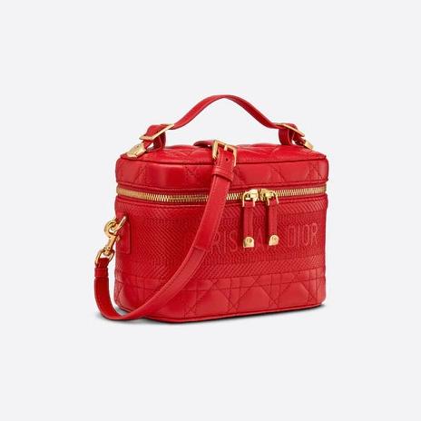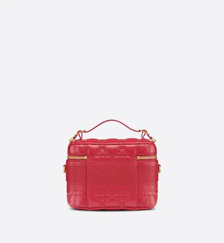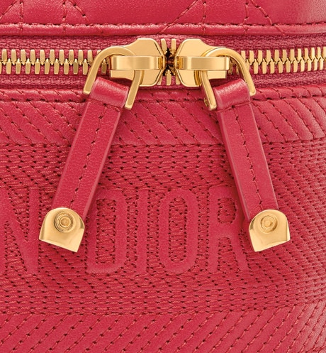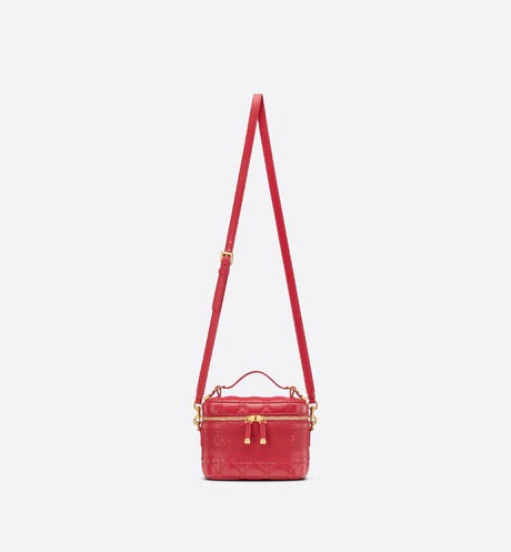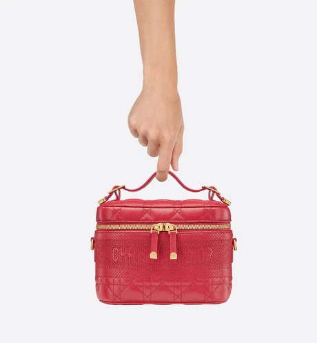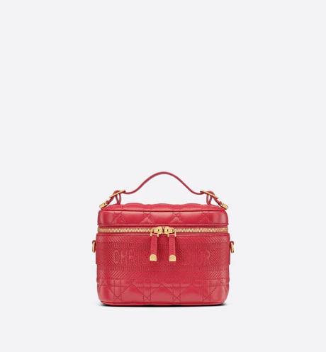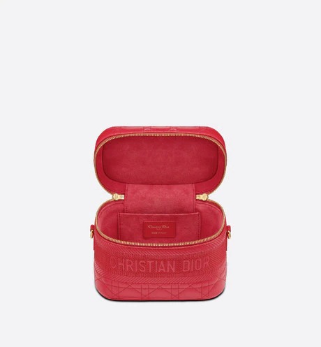 The DiorTravel vanity case, crafted in raspberry supple lambskin, is enhanced by Cannage topstitching and a band embossed with the 'CHRISTIAN DIOR' signature. The design can accommodate a phone, a wallet, a case for AirPods and a notebook. The small accessory is an ideal daily companion and can be carried by hand, worn over the shoulder or crossbody thanks to its handle and removable shoulder strap.