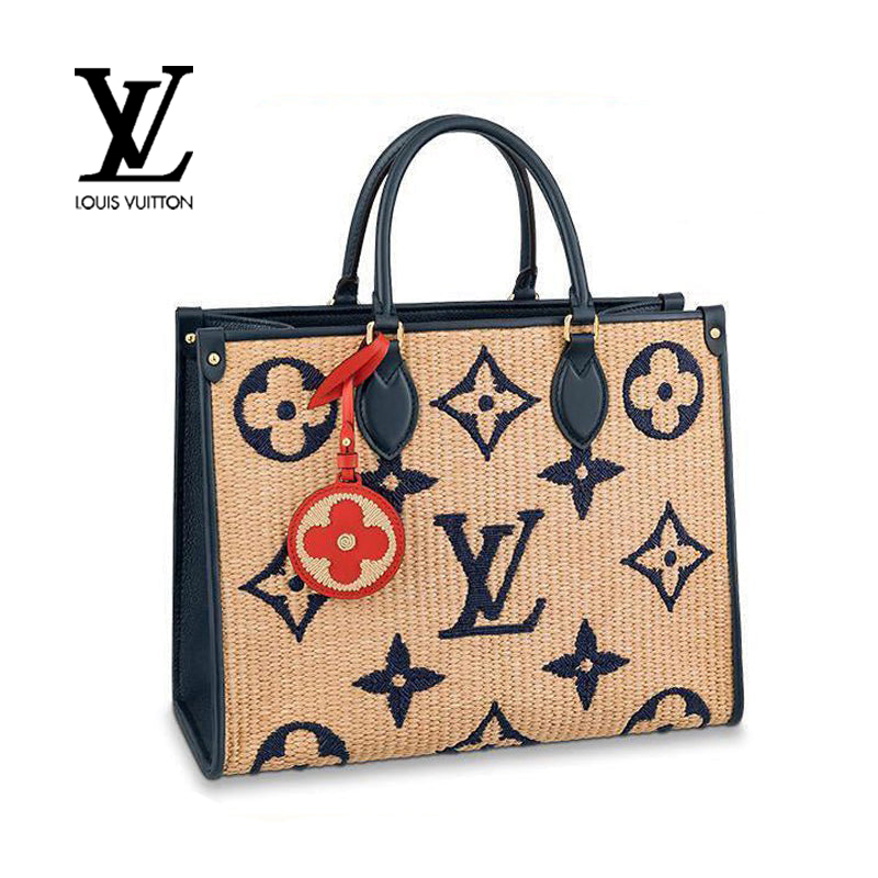 - モノグラム・ラフィア テキスタイルを使用し、レザーハンドル、ショルダーストラップ、マチ付きで仕上げた「オンザゴー MM」。旅行やビーチに最適なバッグです。リサイクルされたコットンと持続可能な方法で調達されたビスコースを組み合わせたモノグラム・ラフィアに、モノグラム・ジャイアント パターンの刺繍をあしらいました。取外し可能なコントラストカラーのバッグチャームが彩りを添えます。