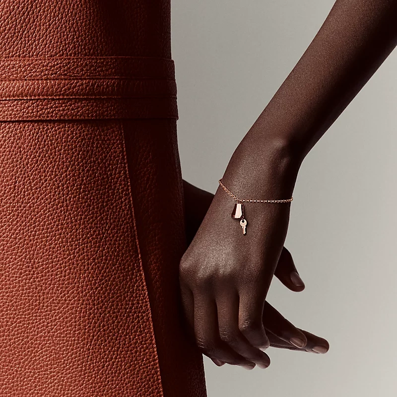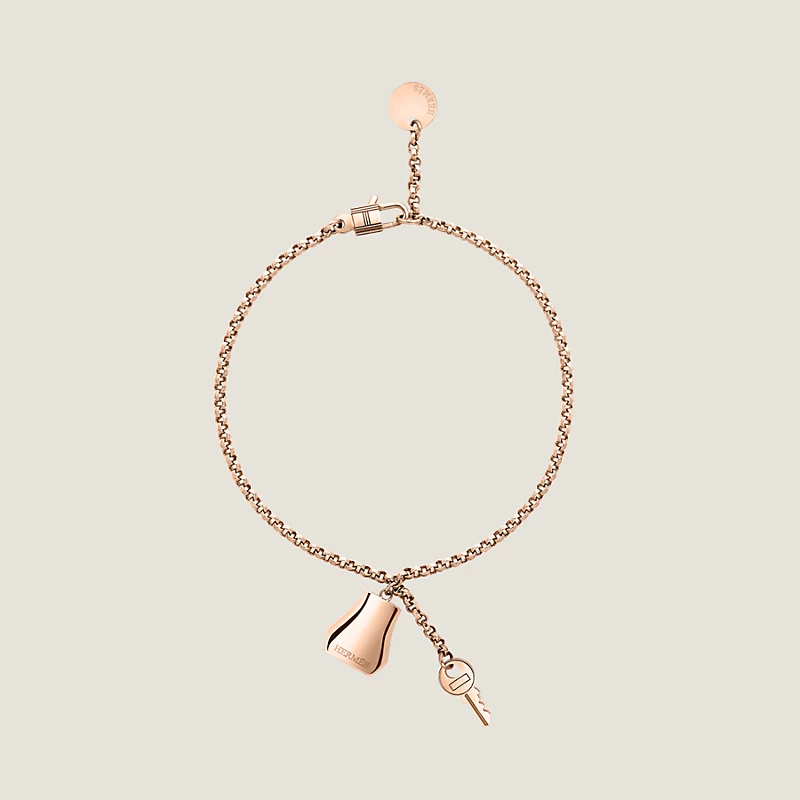 Pierre Hardy reinterprets the clochette shaped leather keycase on Kelly's bag with precious metals.