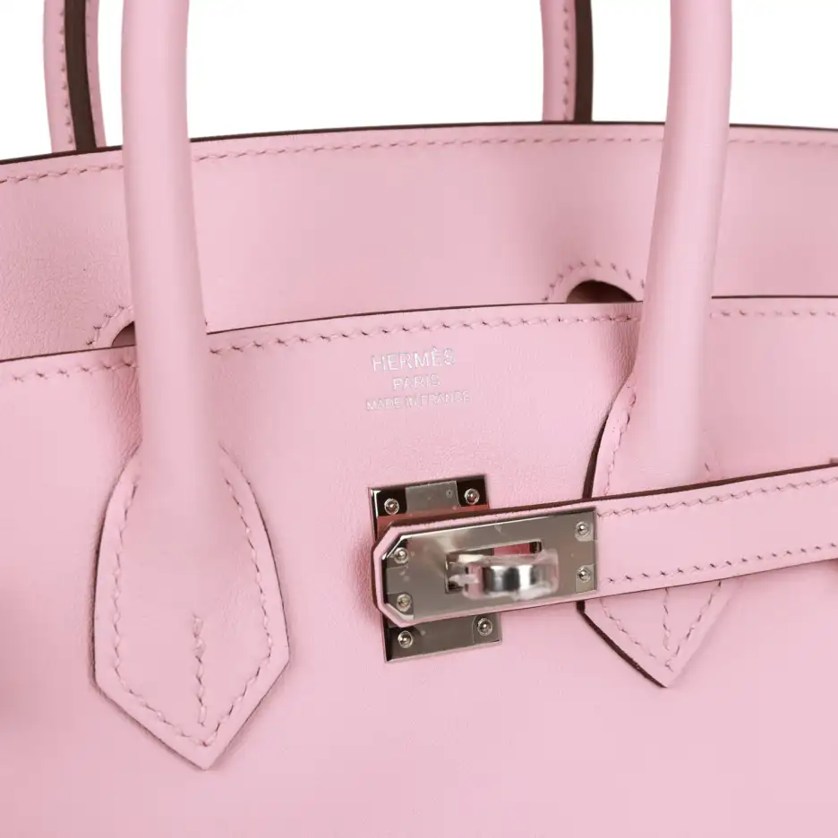 This Birkin is of Rose Sakura swift leather with palladium hardware and features tonal stitching, front flap, two straps with center toggle closure, clochette with lock and two keys, and double rolled handles.