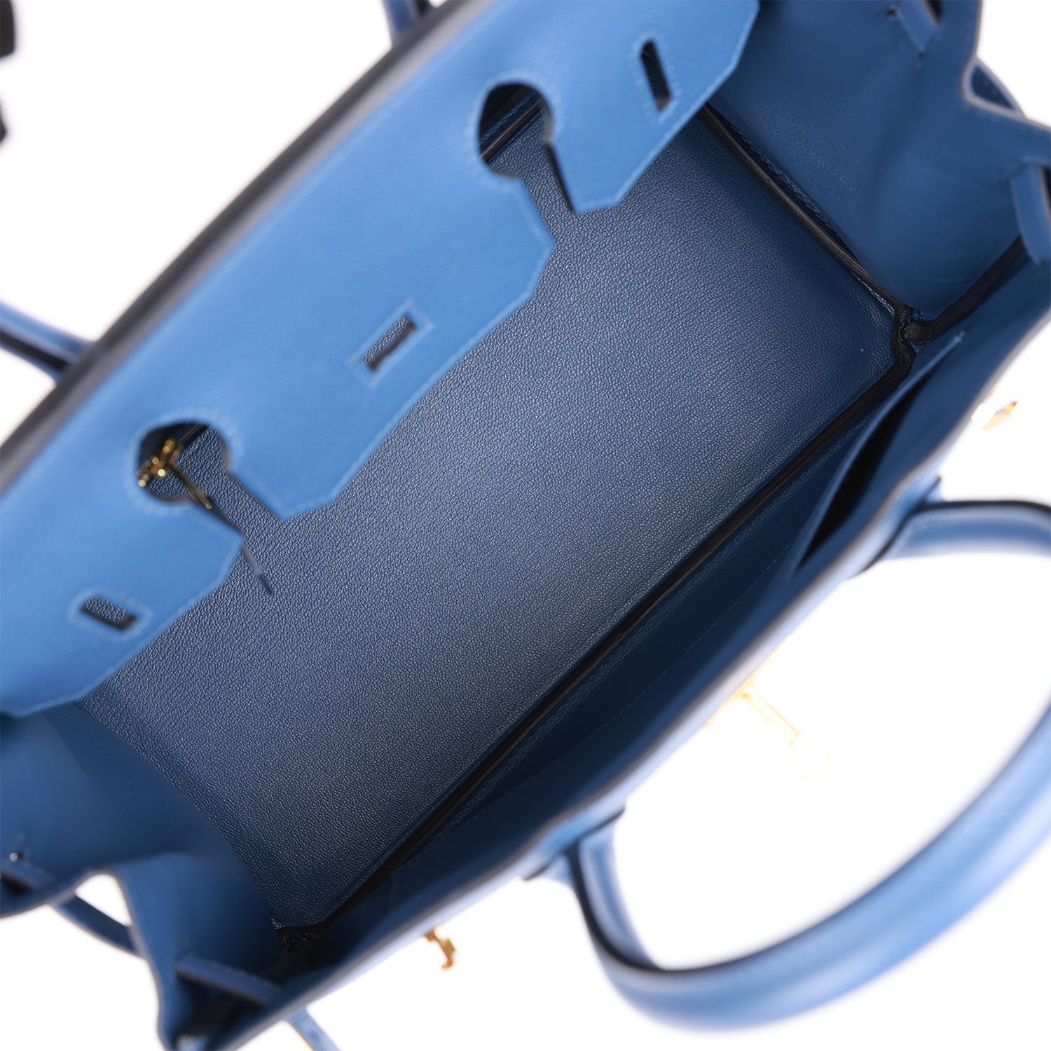 This Birkin is in Bleu Brighton epsom leather with gold hardware and has tonal stitching, front flap, two straps with center toggle closure, clochette with lock and two keys, and double rolled handles.