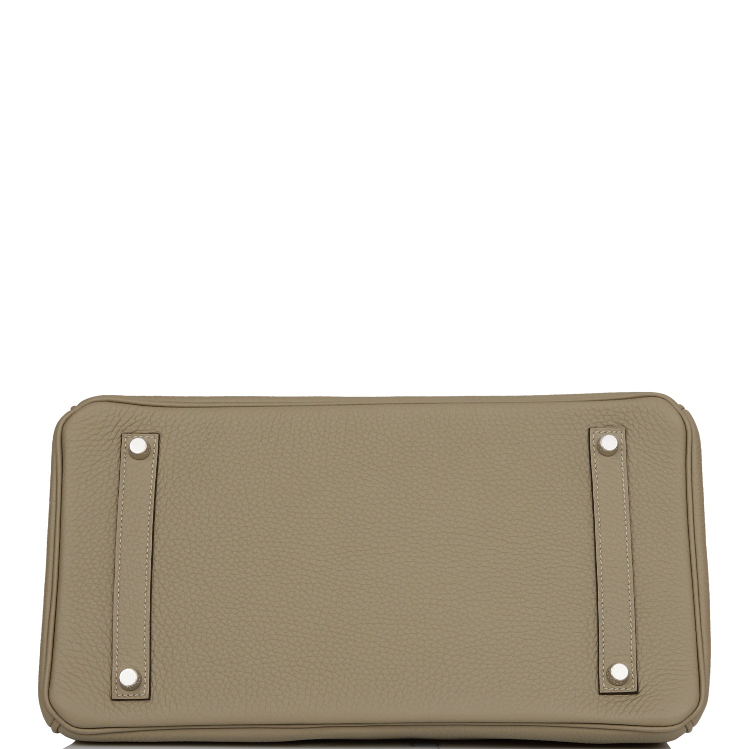 This Birkin is in Sage clemence leather with palladium hardware and has tonal stitching,front flap, two straps with center toggle closure, clochette with lock and two keys, and double rolled handles.