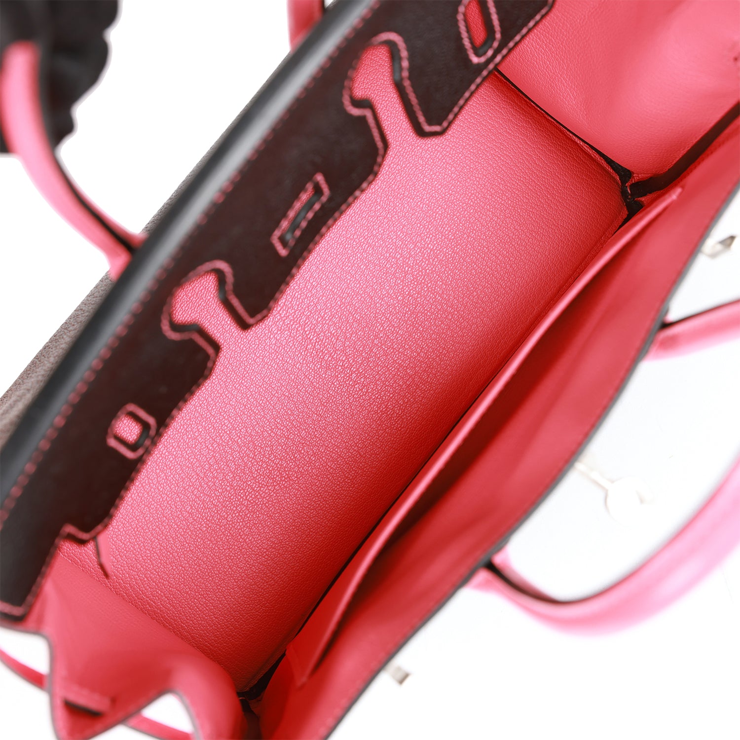 The interior is lined with Rose Azalee chevre and has one zip pocket with an Hermès engraved zipper pull and an open pocket on the opposite side.