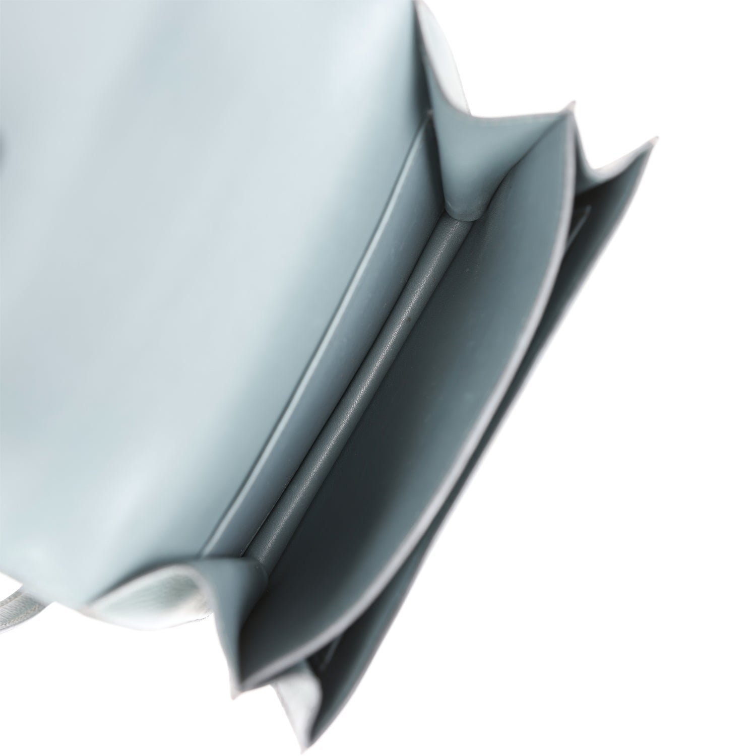 The interior is lined with bleu orage lambskin and has an open pocket on the front wall, a center divide, and a slit pocket on the back wall.