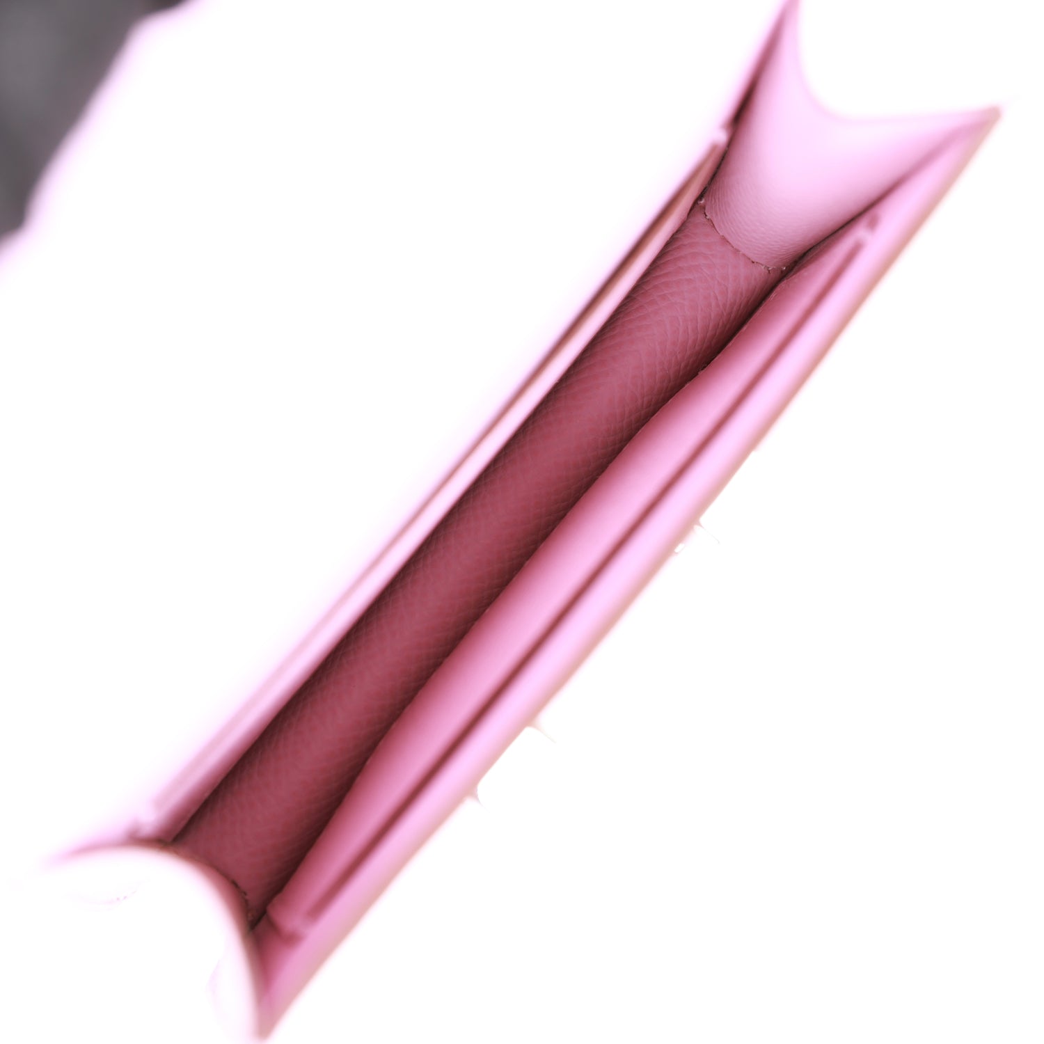 The interior is lined with Mauve Sylvestre leather and features one slip pocket on the rear wall and one on the front wall.