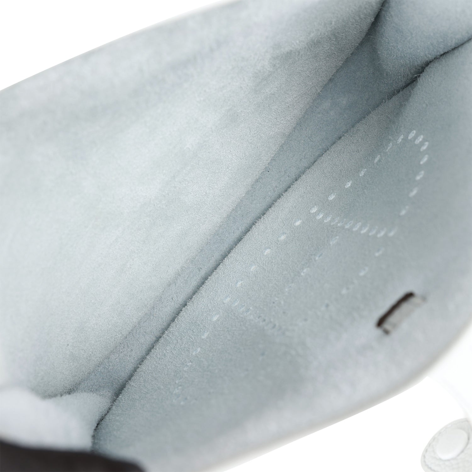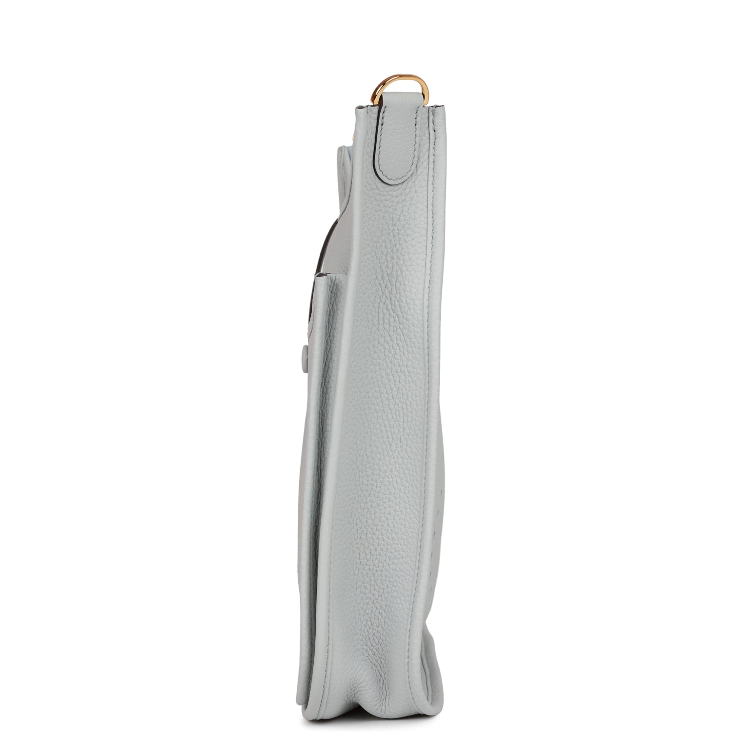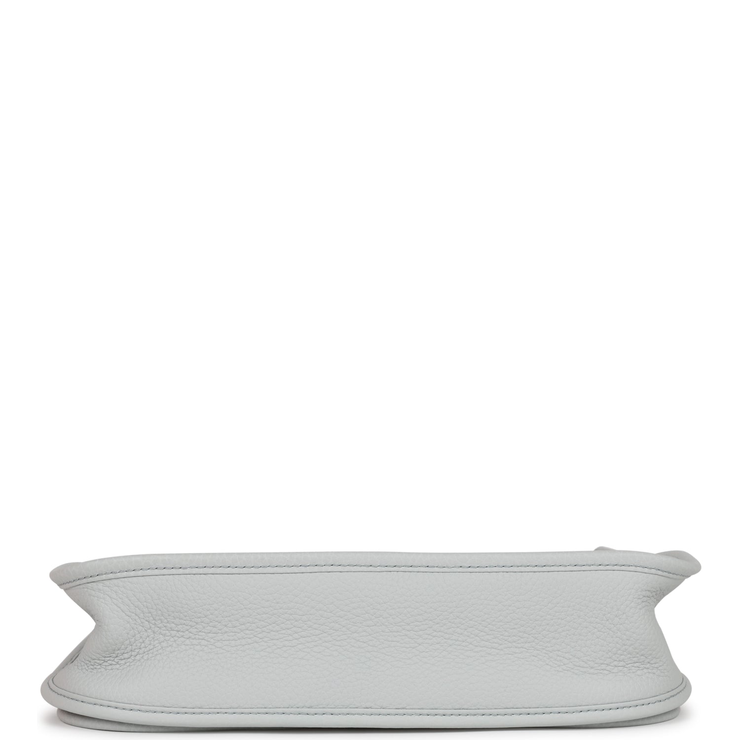 This Evelyne is in Bleu Pale clemence leather with gold hardware and has tonal stitching, pull tab top closure and Bleu Pale removable canvas and leather shoulder/crossbody strap.